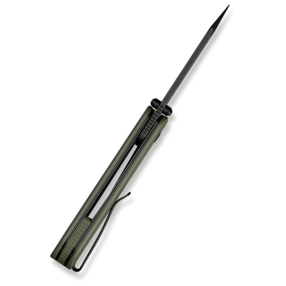 Кліпса з нержавіючої сталі має чорне покриття в тон клинку. Затискач встановлений у положенні Tip-Up під праву руку.