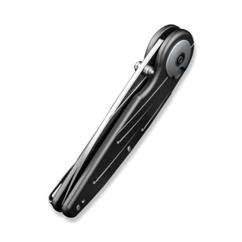 Щоб відкрити конструкцію, потрібно натиснути на двосторонній шпеник або пружну кнопку замка button lock. Керамічні кулькові підшипники сприяють гранично плавному ходу леза, що дозволяє привести інструмент у робоче положення практично миттєво.