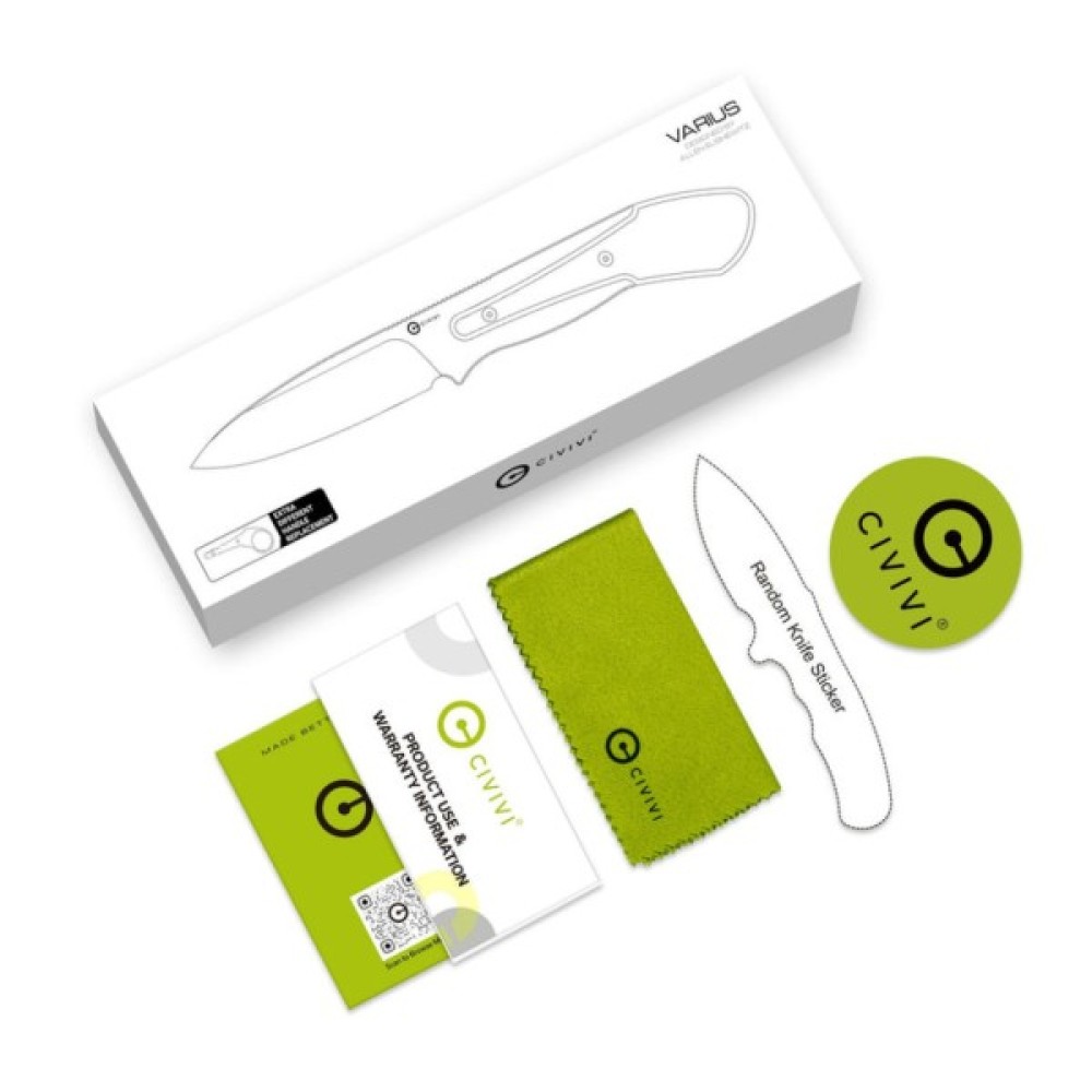 Головна ж особливість ножа Civivi Varius — унікальна конструкція з можливістю кастомізації руківʼя за допомогою 2 типів накладок на вибір: класичних прямих або з хвостовим отвором. Накладки входять до комплекту разом із двома парами кріплень, пропонуючи розширену кількість варіантів хвату руківʼя. Матеріал накладок — склопластик G10 з шорсткою поверхнею, яка не дає долоні ковзати по руківʼю.