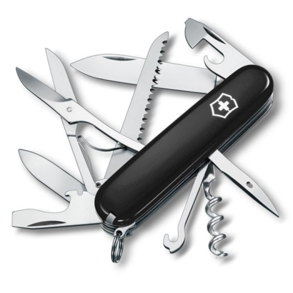 Швейцарський офіцерський ніж VICTORINOX Swiss Army Huntsman (1.3713.3) - універсальний помічник в місті, на риболовлі, в поході. Мається шило з вушком, їм можна прошивати грубі матеріали: шкіру, брезент та ін. Стандартним для ножів цієї марки є наявність 2 откривалок з викрутками на торцях, штопора, пінцета і зубочистки (в окремих пазах) і кільця для підвісу до поясу, зв'язки ключів , карабіну рюкзака. Набір необхідних інструментів розрахований для 15 завдань.