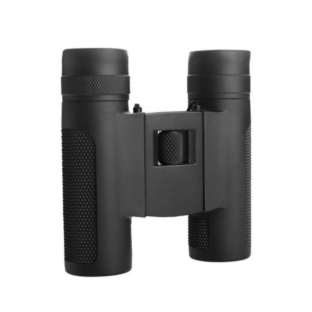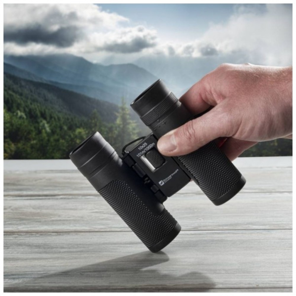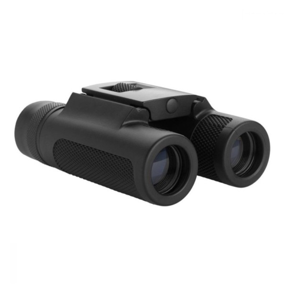 - Бінокль з оптикою 10 x 25 легко поміститься в рюкзаку, кишені або на поясі. Бінокль продається в маленькому чохлі, який можна закріпити на поясі. Також пристрій можна носити на шиї.