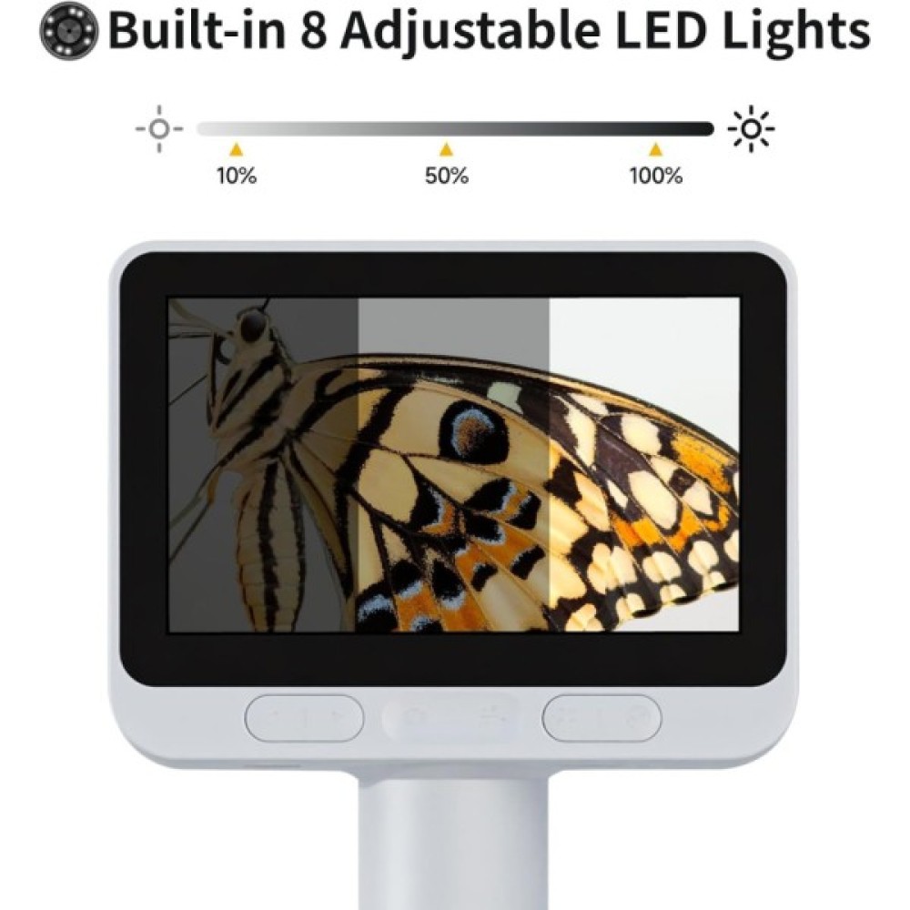 Мікроскоп оснащений 8 вбудованими регульованими світлодіодами, які забезпечують достатнє та рівномірне освітлення. Ви можете легко відрегулювати яскравість, натиснувши кнопку, щоб ваші зразки завжди були чіткими та яскравими.