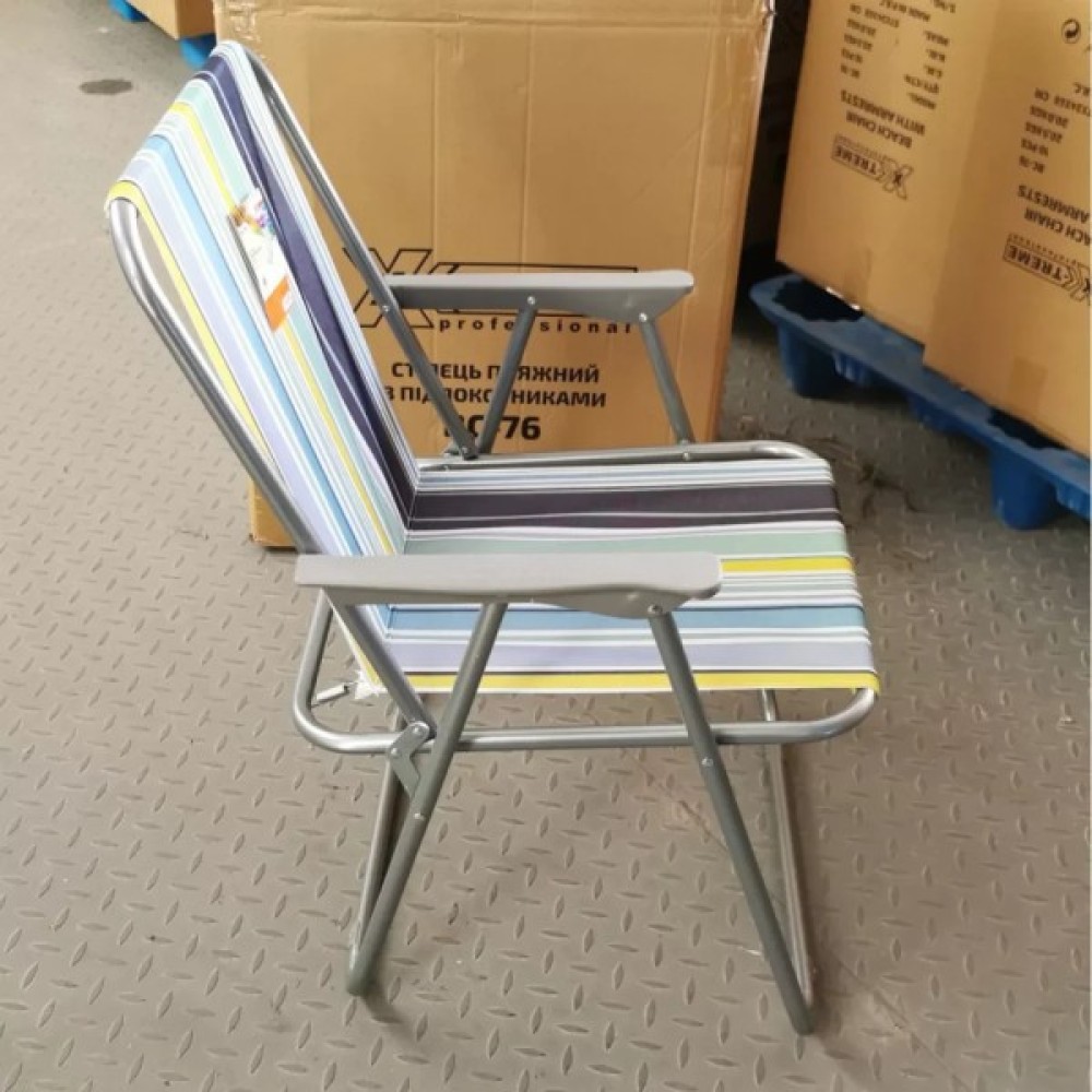 Стілець пляжний з підлокітниками X-Tream - практичний і дуже зручний, забезпечує комфортний відпочинок в будь-яких умовах, ідеально підходить для відпочинку на пляжі, природі або на дачі. Виготовлений із міцного матеріалу, обладнаний комфортними підлокітниками, які дозволять відпочити Вашим плечам. Витримує максимальну вагу 90 кг. Швидко складається та розкладається, займає мало місця при зберіганні та транспортуванні, має легку вагу.