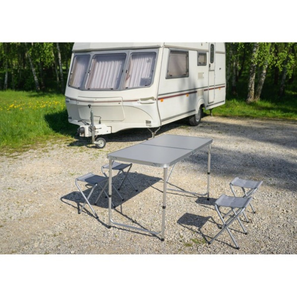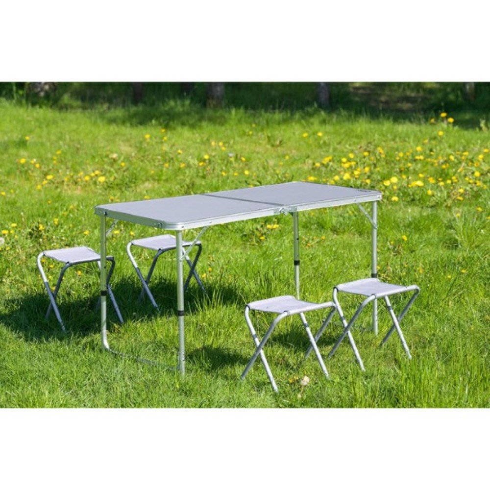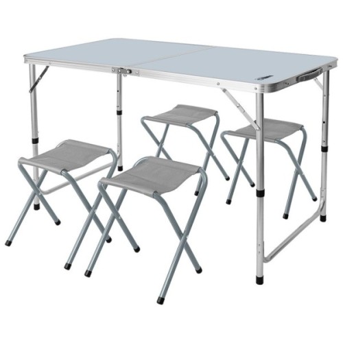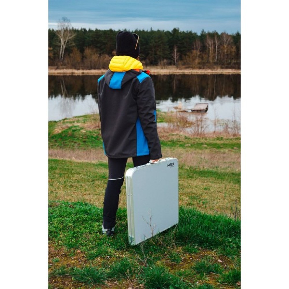 Кемпінговий набір NEO 63-159 являє собою розкладний стіл з чотирма табуретами. Набір, завдяки своїй конструкції, складається в компактну валізу з ручкою для транспортування для зручності перенесення. Регульована висота столу дозволяє підлаштувати його під сидячих людей. Стільниця виготовлена з МДФ, а каркас – з легкого алюмінію. Конструкція крісел виготовлена зі сталі, а сидіння - з міцного поліестеру. Розміри столу: довжина - 120 см, ширина - 60 см, висота - від 54 до 70 см. Табурети характеризуються наступними параметрами: довжина - 33 см, ширина - 27 см і висота - 35 см. Розміри в складеному вигляді у валізу: 60 х 60 х 10,5 см. Вага набору 6,9 кг, а максимальне навантаження на табуретку 110 кг. Кемпінговий набір від бренду NEO рекомендований для широкого спектру застосування.