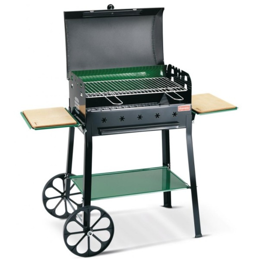 Прямокутний гриль-барбекю Ferraboli GARDA (152) виготовлений з високоміцної сталі, покритий жаростійкою емаллю, укомплектований хромованою решіткою, висота якої регулюється залежно від інтенсивності спека. Має дві бічні полиці, верхню кришку, два колеса, що дозволяє без проблем переміщати барбекю в необхідне місце для приготування їжі або прямо до столу. Грати забезпечена двома ручками.
