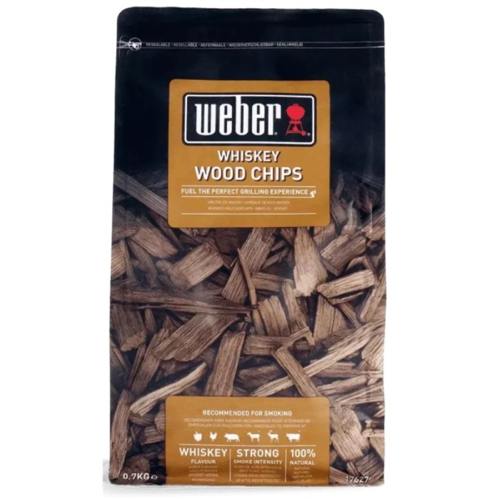 Віскі, що зберігався в бочках, надасть незвичайний солодкий аромат яловичині, свинині, птиці та морепродуктам, завдяки дерев'яним чіпсам для копчення від Weber.