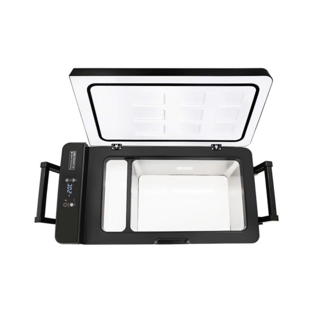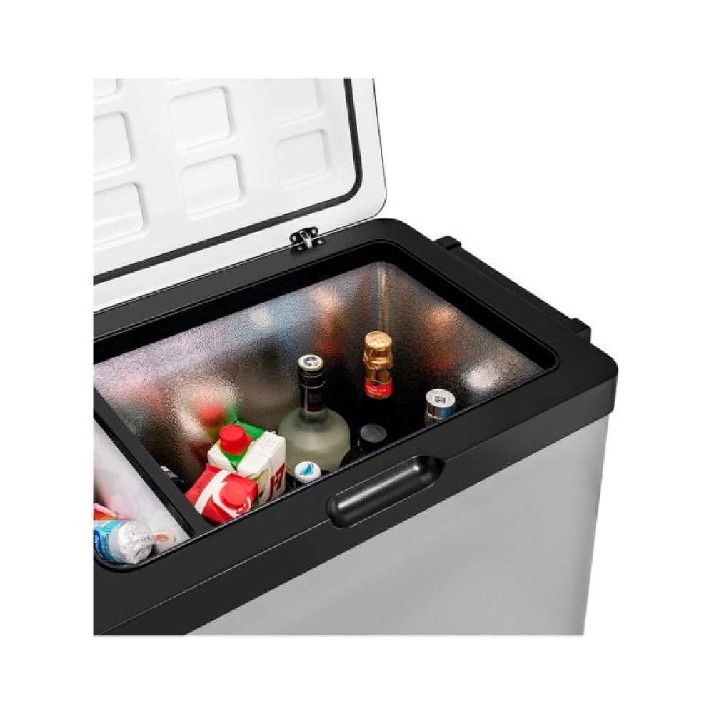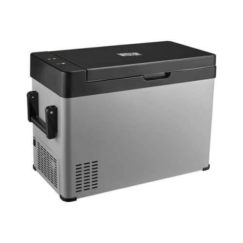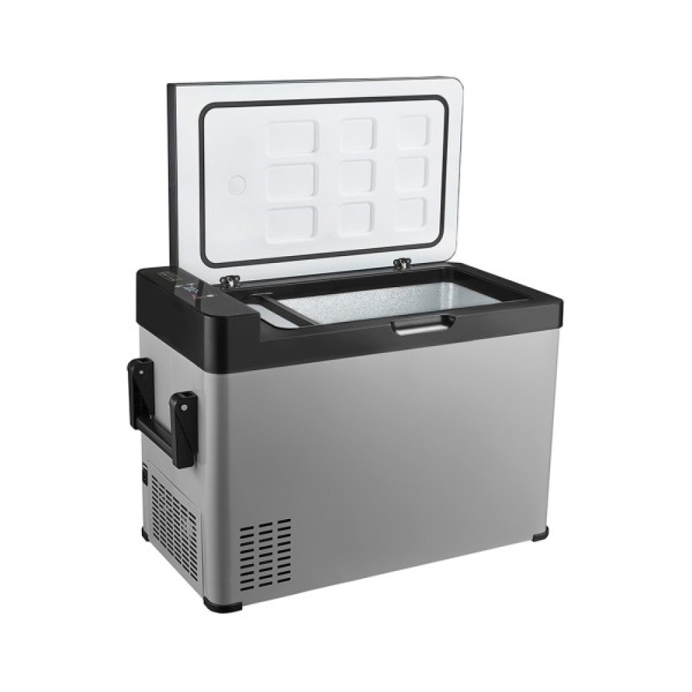Компресорний автомобільний холодильник на 50 літрів, живлення від мережі 12В/24В або 220В, за допомогою адаптера. Для керування передбачені індикатори та сенсорна панель.