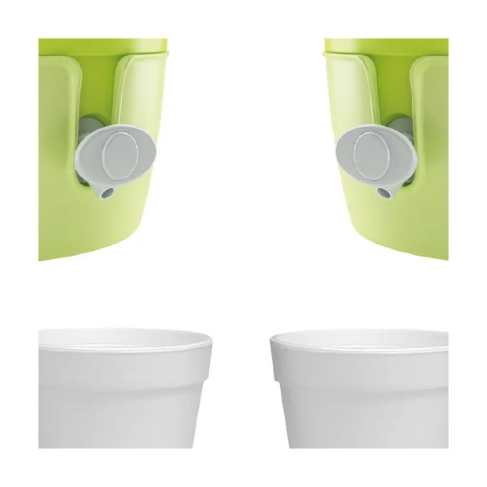 Термоізоляція забезпечується за рахунок суцільного шару спіненого полістиролу в корпусі, що повторює форму контейнера без розривів. Ізотермічна ємність укомплектована краником та знімною основою, що у перевернутому вигляді слугує підставкою, забезпечуючи комфортний розлив напоїв по склянках. Для виливання рідини злегка відкрутіть кришку ємності, потім натисніть кнопку на кранику.