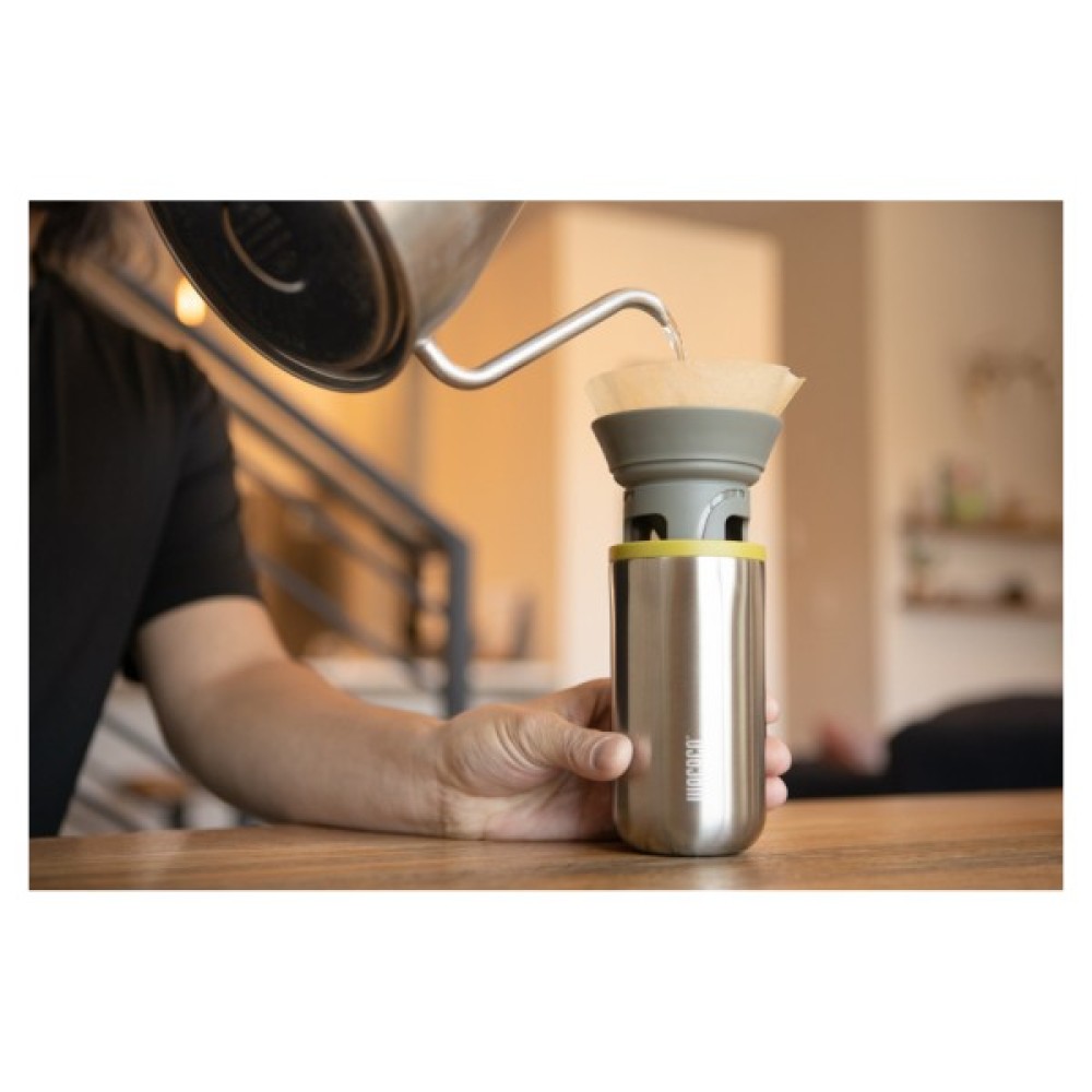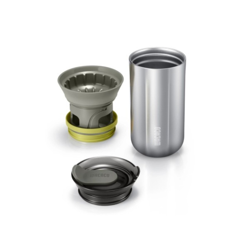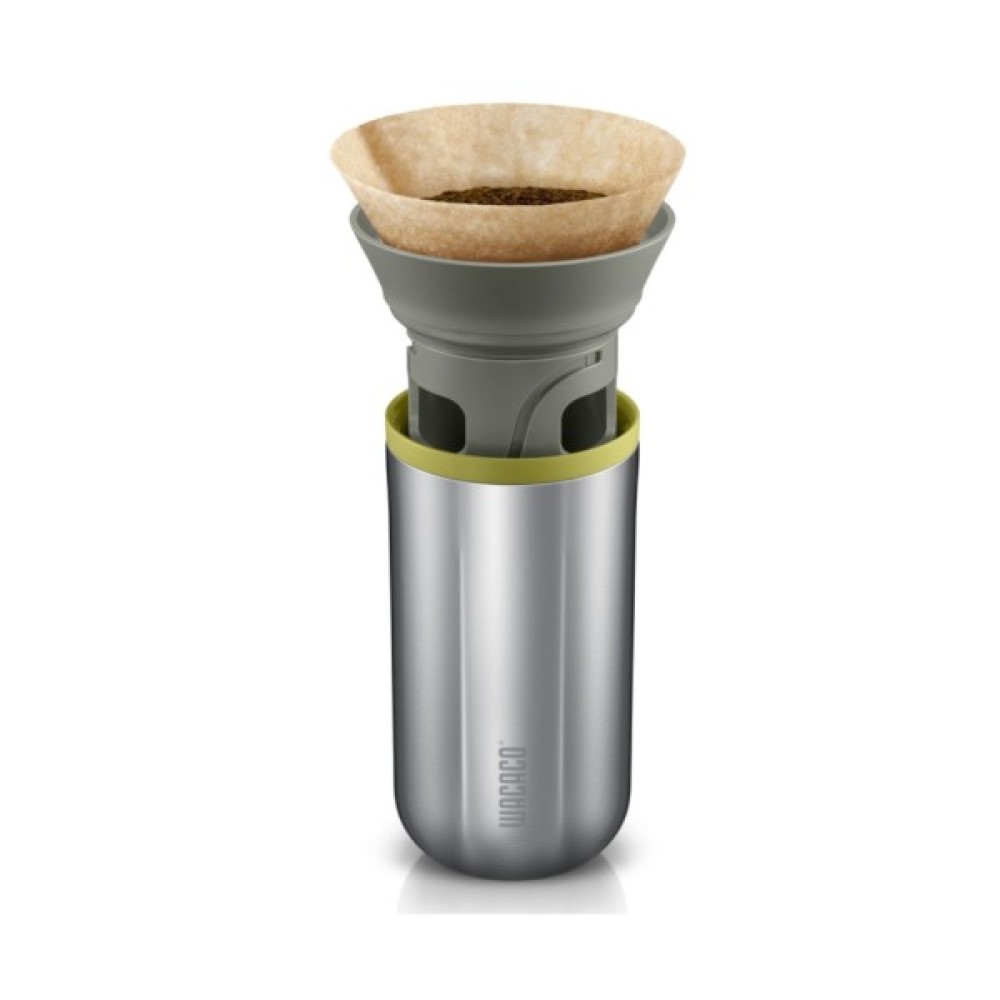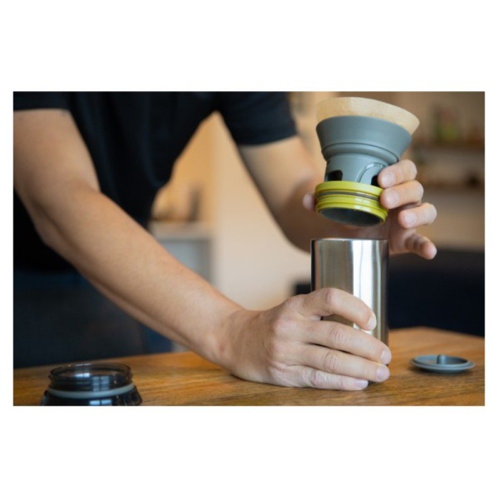 Компактний дріпер-термокухоль Wacaco Cuppamoka призначений для приготування кави методом проливу (пуровер), дозволяючи насолоджуватися ароматним напоєм в офісі, у відрядженні та в подорожі. Аксесуар робить процес заварювання кави швидким і простим: просто встановіть паперовий фільтр (є в комплекті), сумісний з паперовими фільтрами v60, додайте мелену каву, залийте окріп, і через кілька хвилин ваш напій готовий. До того ж Cuppamoka можна використовувати як термокухоль, герметична кришка якого запобігає проливанню рідини.