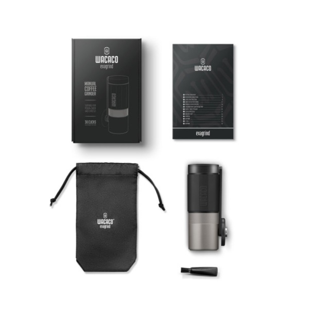 Кавомолка Wacaco Exagrind, щіточка для чищення, чохол для зберігання, інструкція користувача.