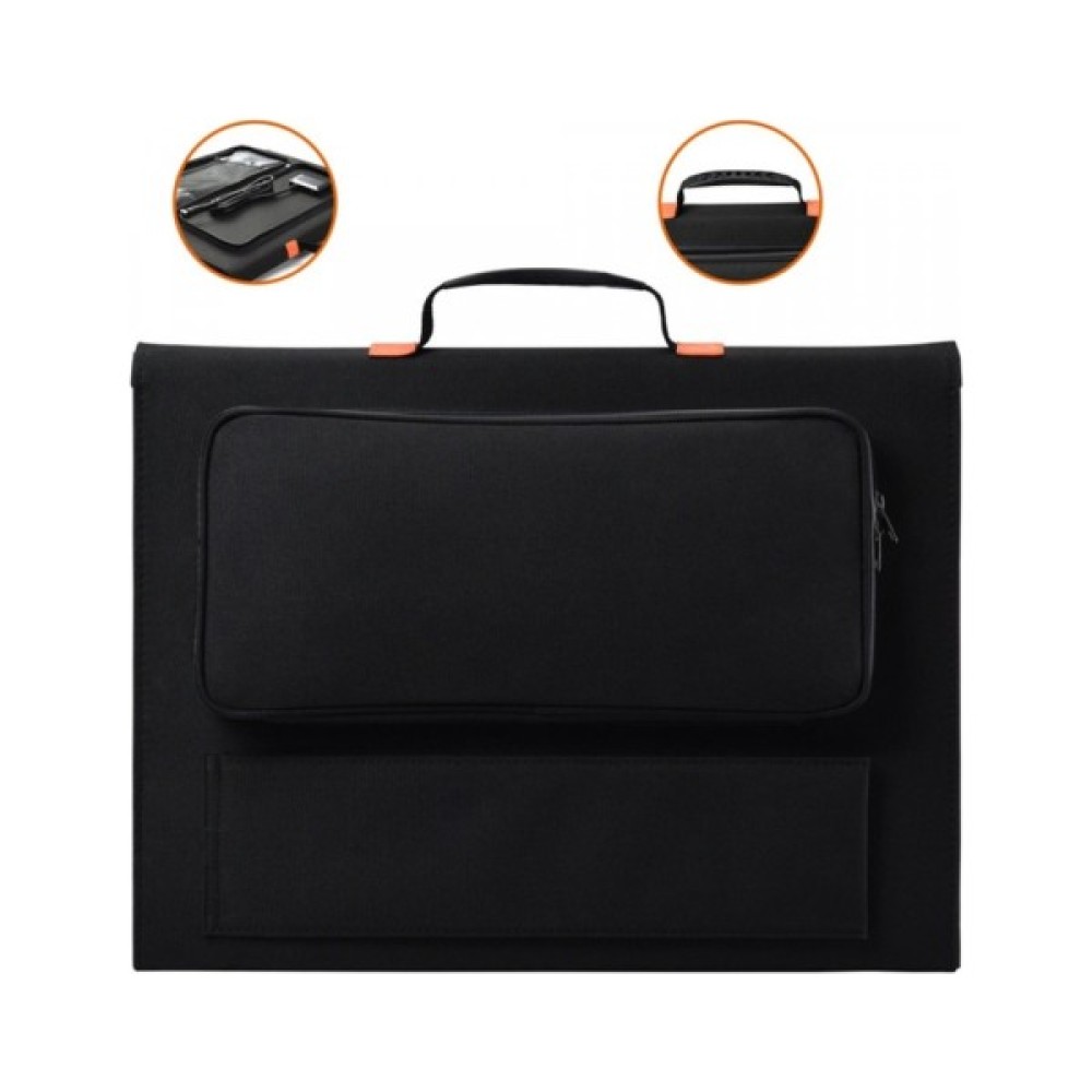 Компактний розмір сонячної панелі дозволяє зручно перевозити її у транспорті та зберігати у невеликих приміщеннях. Гумова ручка допоможе легко перенести її на вулицю у разі несподіваного відключення електроенергії.