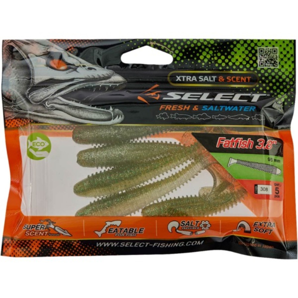 Силікон Select Fatfish - віброхвіст з об'ємним тілом, покритим м'якими ребрами, як і у моделі Fetish. У приманки Fatfish в нижній частині є спеціальне місце для додаткової огрузки, якщо передбачається використовувати в якості свімбейта.