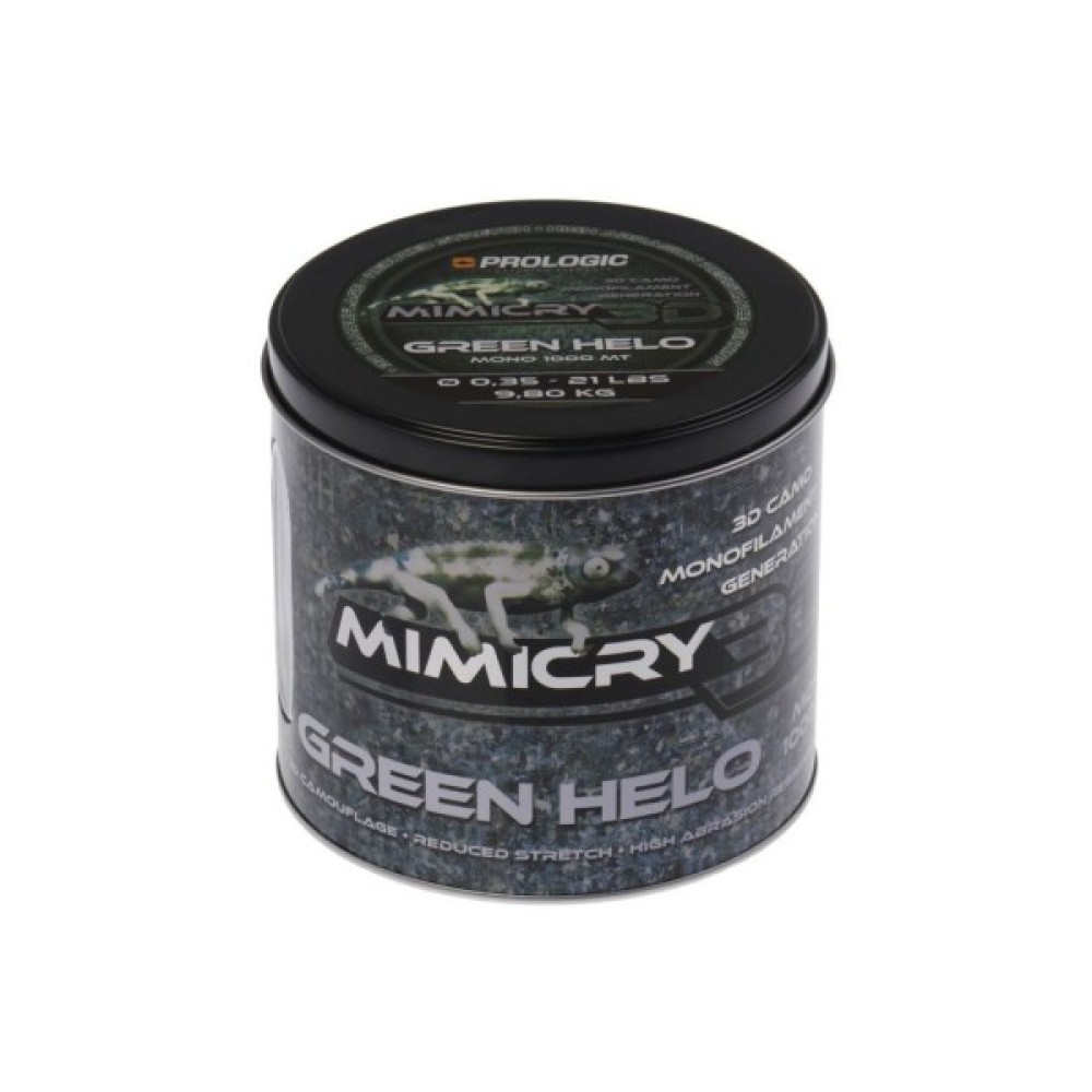 Волосінь Prologic Mimicry Green Helo - нова модель в сімействі камуфльованих монолісок для коропового лову Mimicry 3D. Ідеально маскуються на тлі дна завдяки кардинально новому підходу застосування кольорів - волосінь містить три відтінки зеленого. При розробці була поліпшена структура монофільного волокна за рахунок якісного полімерного матеріалу. Така комбінація дала чудовий баланс, між діаметром і розривним навантаженням, також зробивши її неймовірно стійкою до абразиву. Волосінь має малу ступінь розтяжності і практично не має пам'яті. Її діаметр і характеристики не змінюються при тривалому перебуванні у воді і під дією ультрафіолету, така особливість волосіні дуже важлива під час тривалих рибальських сесій, а також під час змагань, коли місце лову часто розташоване далеко від берега.