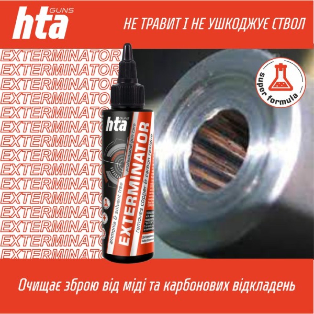 Очищувач ствола HTA Exterminator - засіб для видалення міді та нагару в каналі ствола зброї. Нейтралізує залишки корозії, запобігаючи пошкодженню ствола.