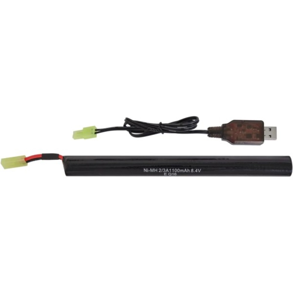 Особливості магазин (1), Кулі страйк. 100 шт./уп. (1), USB-зарядка (1), Акамулятор (1), Інструкція (1); конектор Mini Tamiya; матеріал рамки Пластик