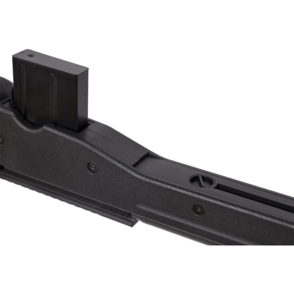 Гвинтівка працює на пружинній системі, що робить її простою і надійною в експлуатації: мінімум обслуговування, стабільна механіка і передбачуваний результат кожного пострілу. Така схема відмінно підходить для тих, хто цінує надійність і незалежність від акумуляторів або газу.CM.703 оснащена регульованою системою Hop-Up, що дозволяє точно налаштувати траєкторію польоту кульки під потрібну дистанцію і вагу боєприпасу.