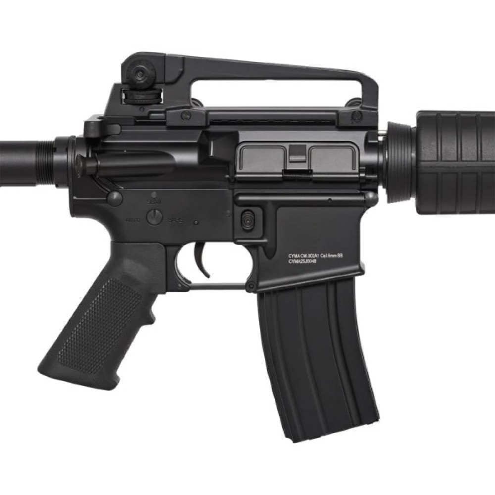 CYMA CM.002A1 — це страйкбольна електропневматична репліка (AEG) на базі гвинтівки M4A1/AR-15 у класичному повнорозмірному виконанні. Модель добре підходить для ігор на середній дистанції та універсального використання на полігоні, а завдяки популярній платформі M4 її легко адаптувати під різні стилі гри.