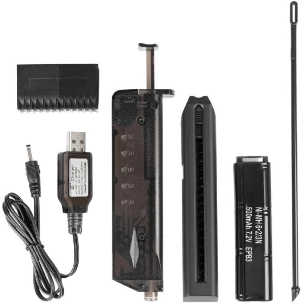 Живлення забезпечує акумулятор 7.2V Ni-MH, який відразу йде у комплекті із пістолетом. Стандартний магазин вміщує 28 BB куль, а за потреби можна використовувати подовжені магазини підвищеної ємності.