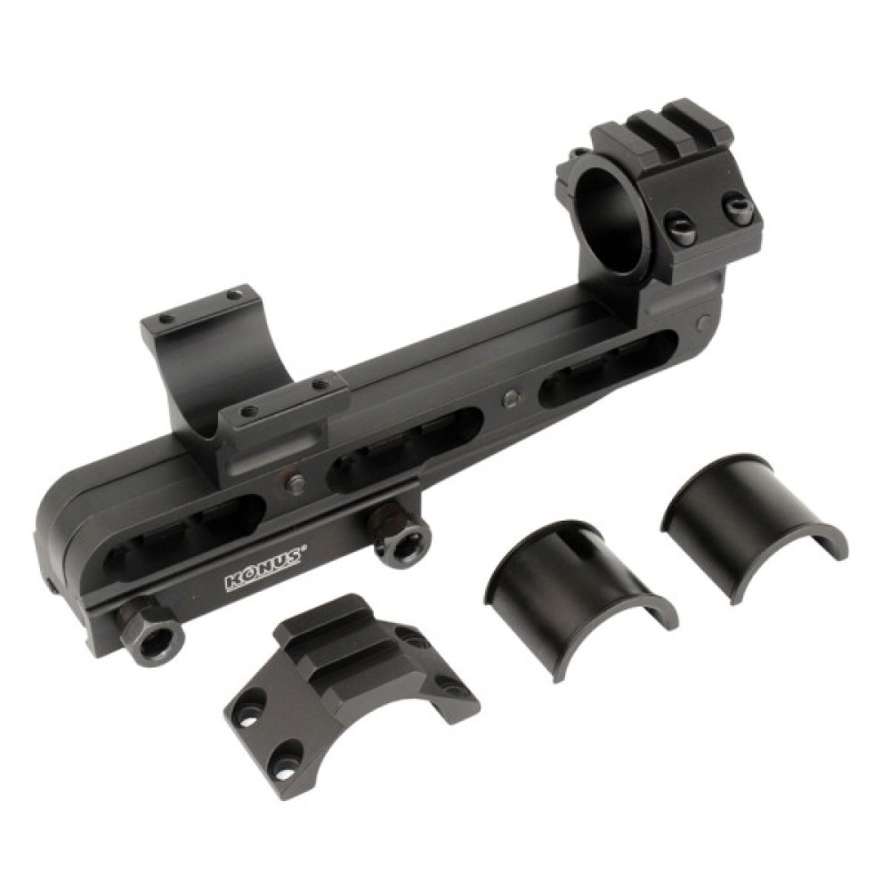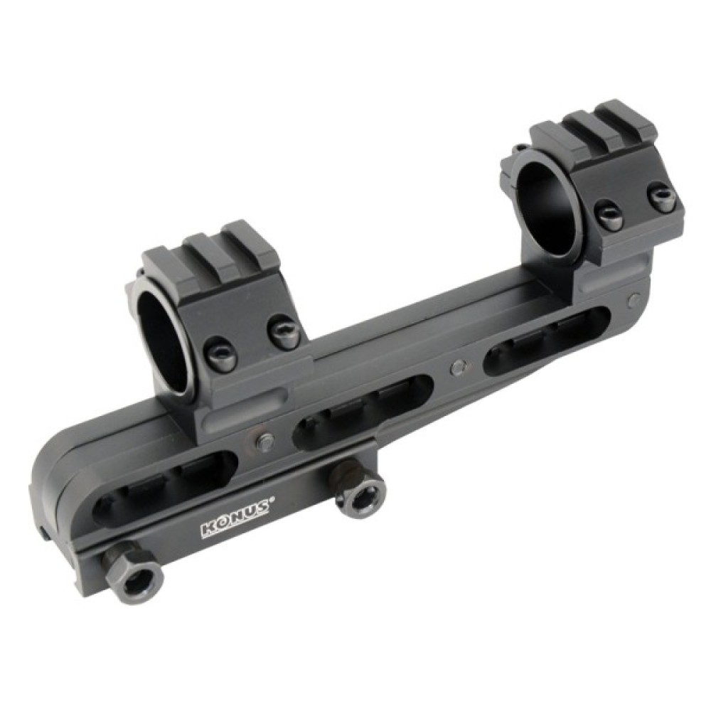 Кonus Cantilever Mount 25.4/30 мм (7219) - універсальне кріплення для оптичних прицілів Konus, яке встановлюється на планку Вівер/Пікатінні. Це найбільш передова система кронштейнів під мисливську оптику, що пропонує повну свободу та універсальність. Кріплення розраховане на діаметр трубки прицілів 25.4 мм та 30 мм. У комплекті йдуть спеціальні вкладки для дюймових моделей. Конструкція припускає регулювання як за довжиною, так і за висотою. Виробник також передбачив інтегровану планку Вівер/Пікатінні для встановлення додаткових аксесуарів на верхній частині кріплення.