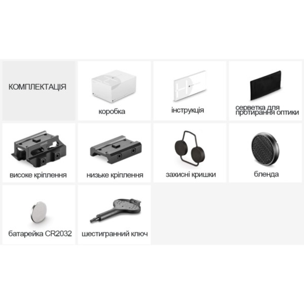Додатково ключ Torx; 10 рівнів яскравості; серветка для протирання оптики; багатошарове покриття; сонцезахисна бленда