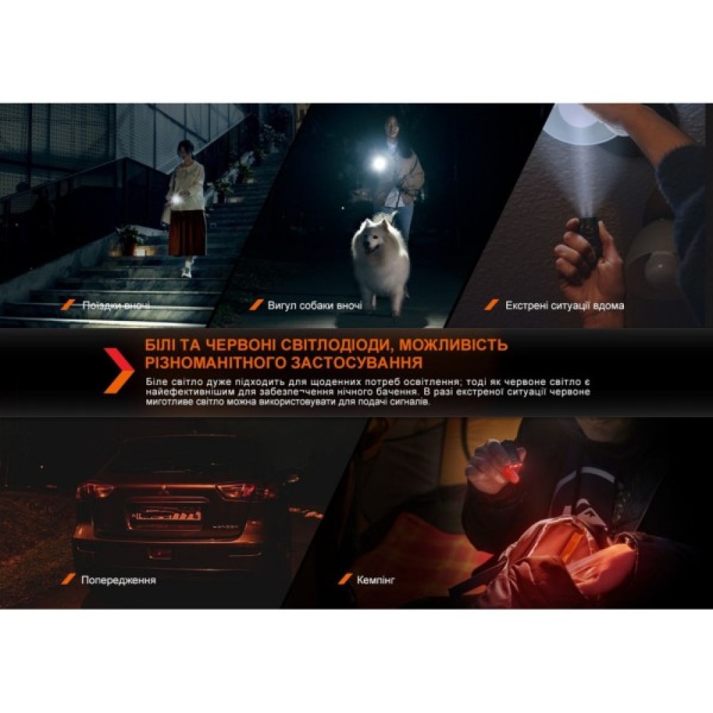 Fenix E03R V2.0 включає в себе 7 режимів роботи, надаючи можливість вибору між різними варіаціями освітлення. Серед них не лише традиційні білий, але й червоний світло. Це дозволяє адаптувати освітлення до різних потреб, таких як економія заряду чи сигналізація за допомогою червоних спалахів.
