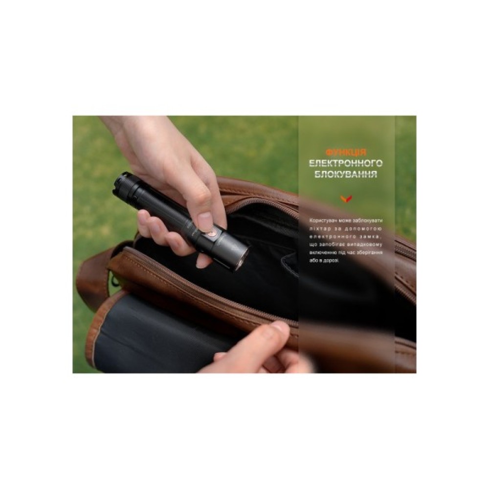захист від перегрівання при високій потужності; ремінець на руку; режим блокування; функція пам'яті: при повторному увімкненні ліхтар автоматично вмикається в останньому вибраному режимі; ущільнювальне кільце