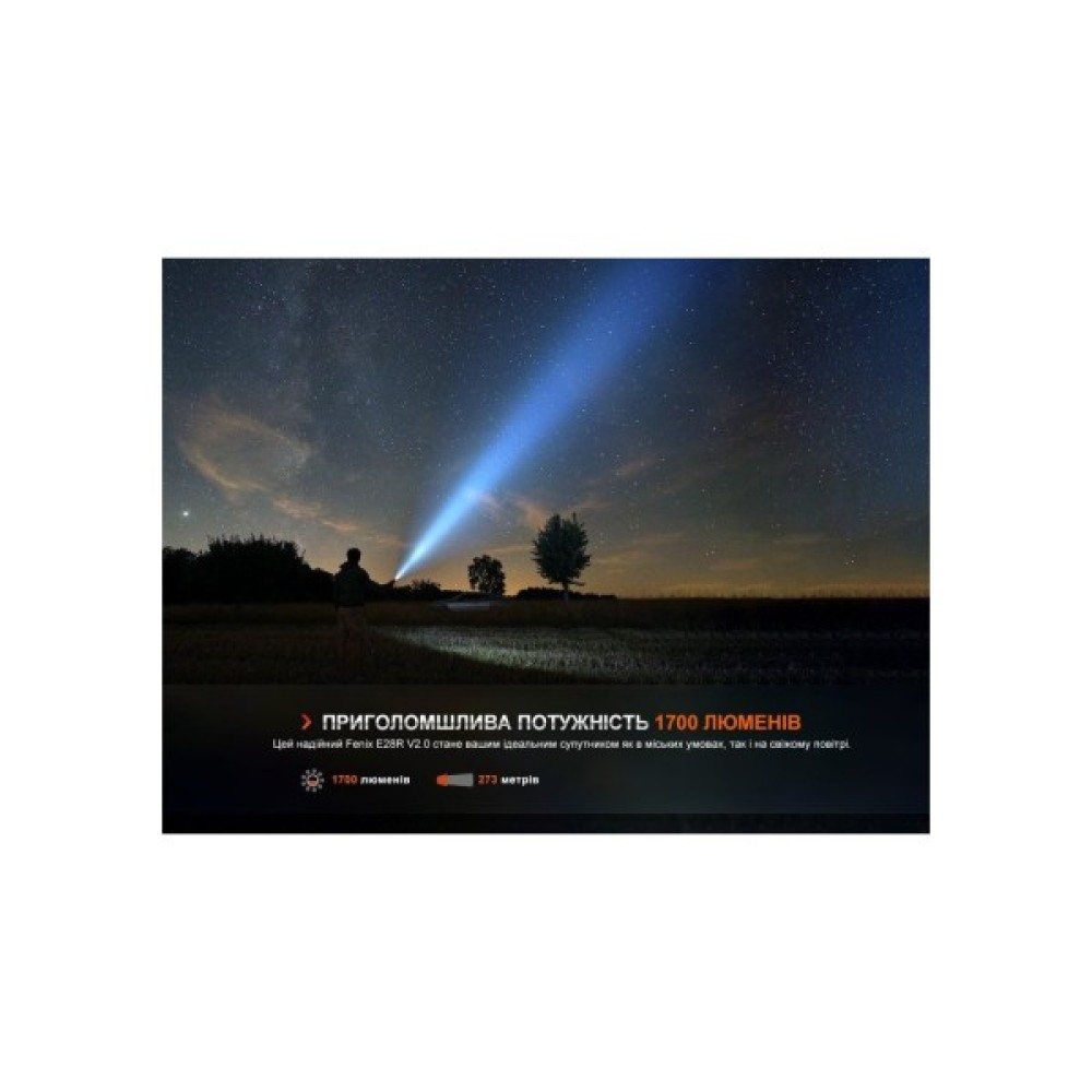 Ліхтар Fenix E28R V2.0 (E28RV20) — це поєднання сучасних технологій із надійністю, що створено для тих, хто цінує високу якість і функціональність у компактному дизайні. Цей ручний ліхтар має потужне джерело світла — світлодіод Luminus SST40, що забезпечує яскравість у 1700 люмен і дальність світлового потоку до 273 метрів. Зроблений з увагою до найдрібніших деталей, він ідеально підходить для використання в різних умовах, забезпечуючи високу якість освітлення та надійність навіть у найскладніших ситуаціях.