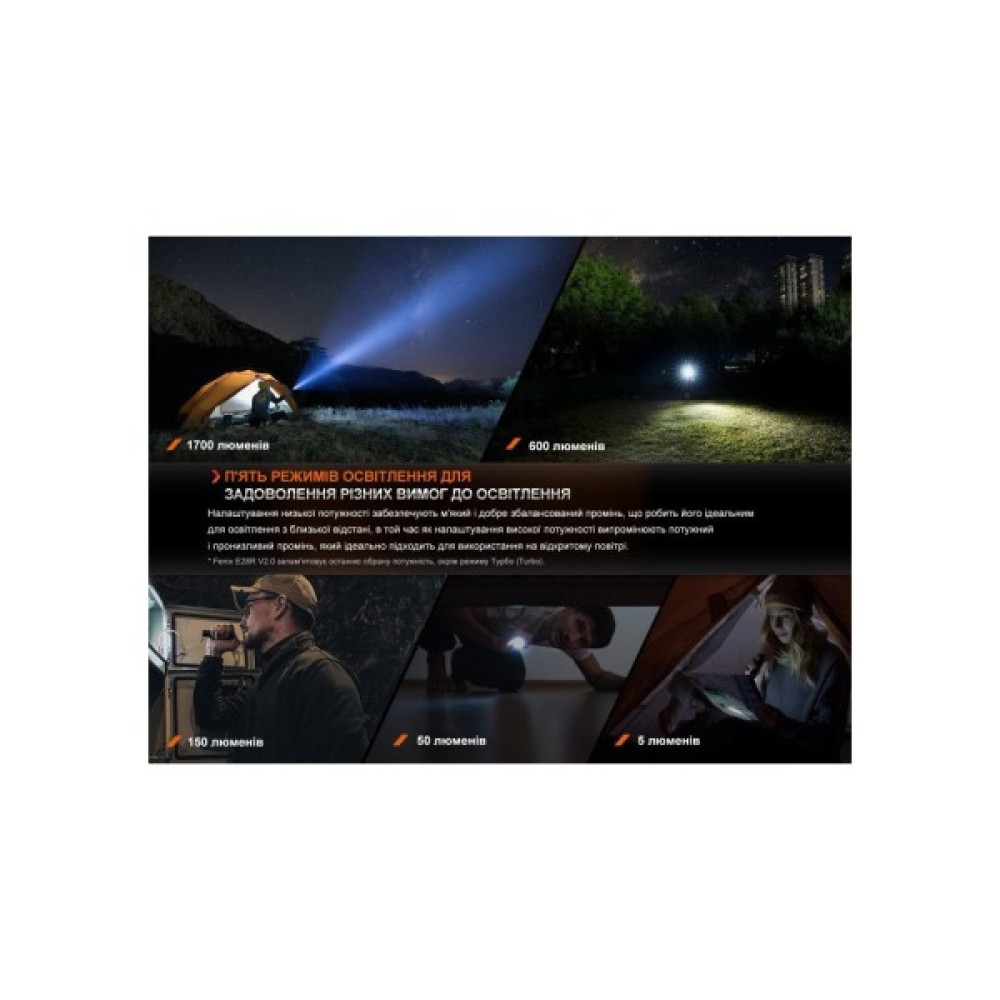 Особливості та переваги Fenix E28R V2.0 вражають. Цей ліхтар може похвалитися семи режимами яскравості, розподіленими на три основні групи. Включає такі режими: турбо, високий, середній, низький, еко, стробоскоп та унікальне підсвічування кнопки керування, що спрощує пошук ліхтаря у темряві. Турбо-режим забезпечує максимальну яскравість і сяйво на вражаючій відстані до 273 метрів протягом 2 годин 10 хвилин. Особливий режим підсвічування дозволяє оперативно знайти пристрій у темних приміщеннях або на природі.