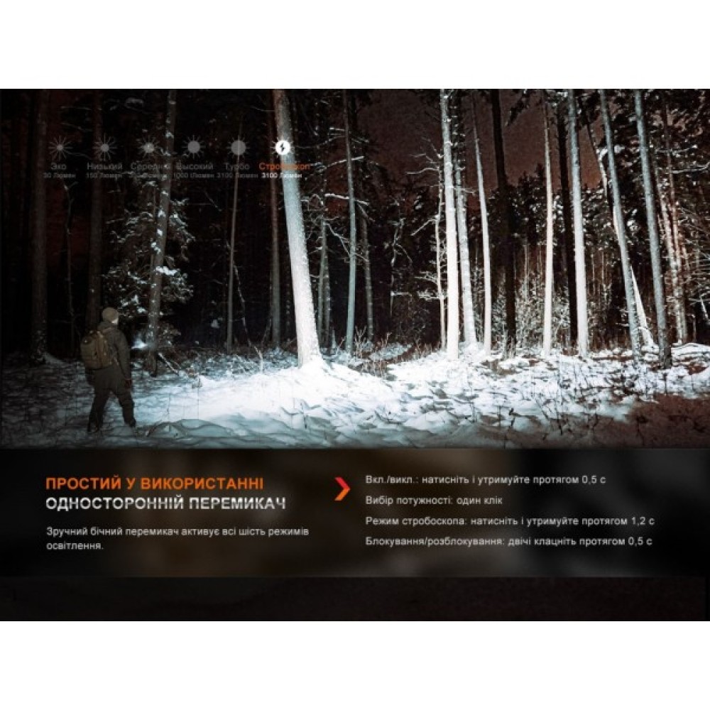 Ліхтар Fenix E35R – це універсальний інструмент, що підійде як для професійного застосування, так і для буденних завдань. Цей ручний ліхтар вирізняється неймовірною яскравістю до 3100 люменів, що дозволить вам бачити навіть у найтемніших умовах. Завдяки дальності світлового потоку у 260 метрів та світлодіоду Luminus SST70, E35R забезпечує рівномірне освітлення з високим рівнем ясності.