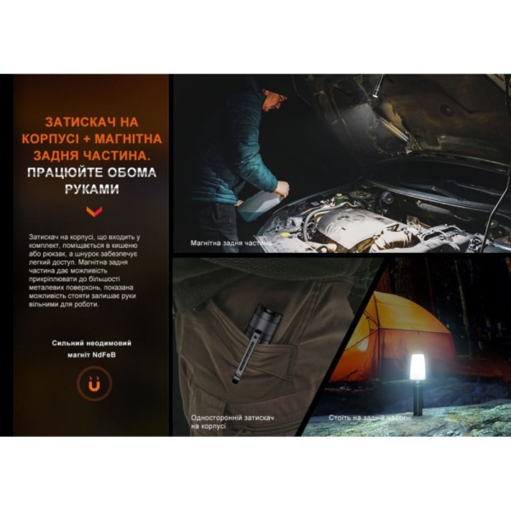 Ергономічність – ще одна з переваг Fenix E35R. Довжина корпусу становить лише 120 мм, а вага – всього 148 г, що робить його легким і зручним для щоденного носіння. Обладнаний знімною кліпсою, ліхтар легко кріпиться на ремінь або кишеню, а завдяки магніту у хвості його можна закріпити на металевій поверхні, залишивши руки вільними.