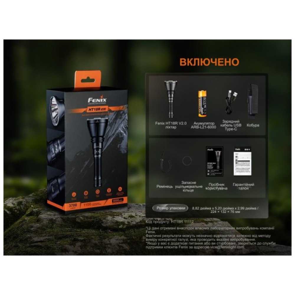 У комплекті з ліхтарем йдуть усі необхідні аксесуари: акумулятор ARB-L21-6000, зарядний кабель USB-C, темляк, чохол, запасне ущільнювальне кільце, а також інструкція користувача та гарантійний талон. Це робить Fenix HT18R v2.0 повністю укомплектованим рішенням для будь-яких завдань, які вимагають надійного освітлення.