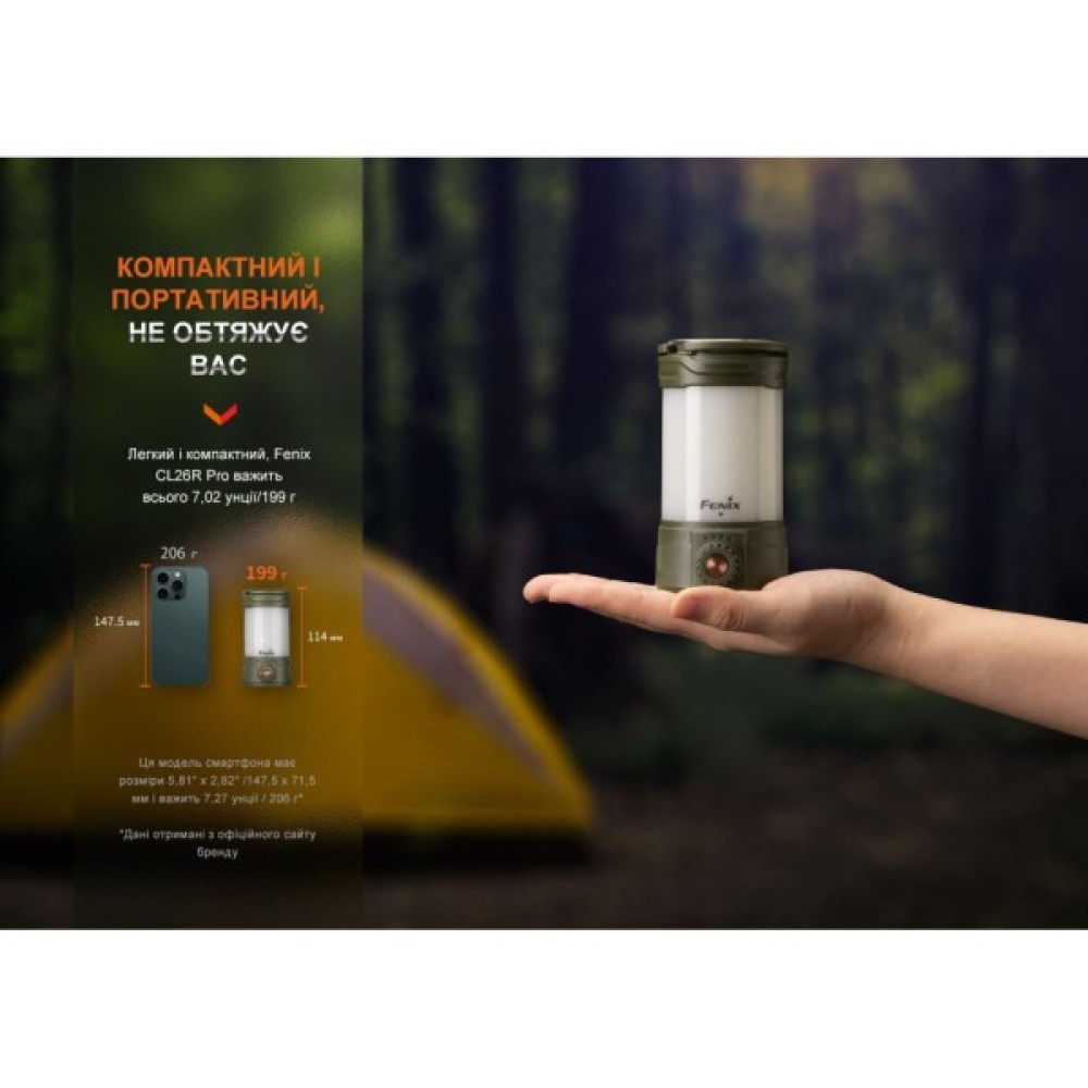 Компактні розміри (66 х 59.5 х 114 мм) і маса 199 грамів роблять ліхтар Fenix CL26R Pro не лише практичним, але й ідеальним для будь-яких видів діяльності на свіжому повітрі. Його темно-зелений колір додає стилю та легко вписується в природне оточення, підкреслюючи ваш тонкий смак та любов до якісного обладнання.