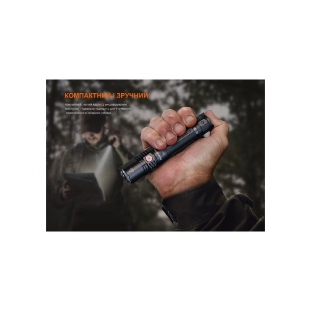 Потужне живлення здійснюється від літій-іонного акумулятора розміром 21700, що входить у комплект. Акумулятор Fenix ARB-L21-5000 V2.0 має великий ресурс — 800 циклів заряджання-розряджання та ємність 5000 мАг, забезпечуючи до 482 годин безперервної роботи, що еквівалентно 20 дням в економічному режимі. Зарядка здійснюється через сучасний порт USB Type-C, що підтримує технологію швидкої зарядки. Процес займає до 2,5 годин завдяки потужності 18 Вт.