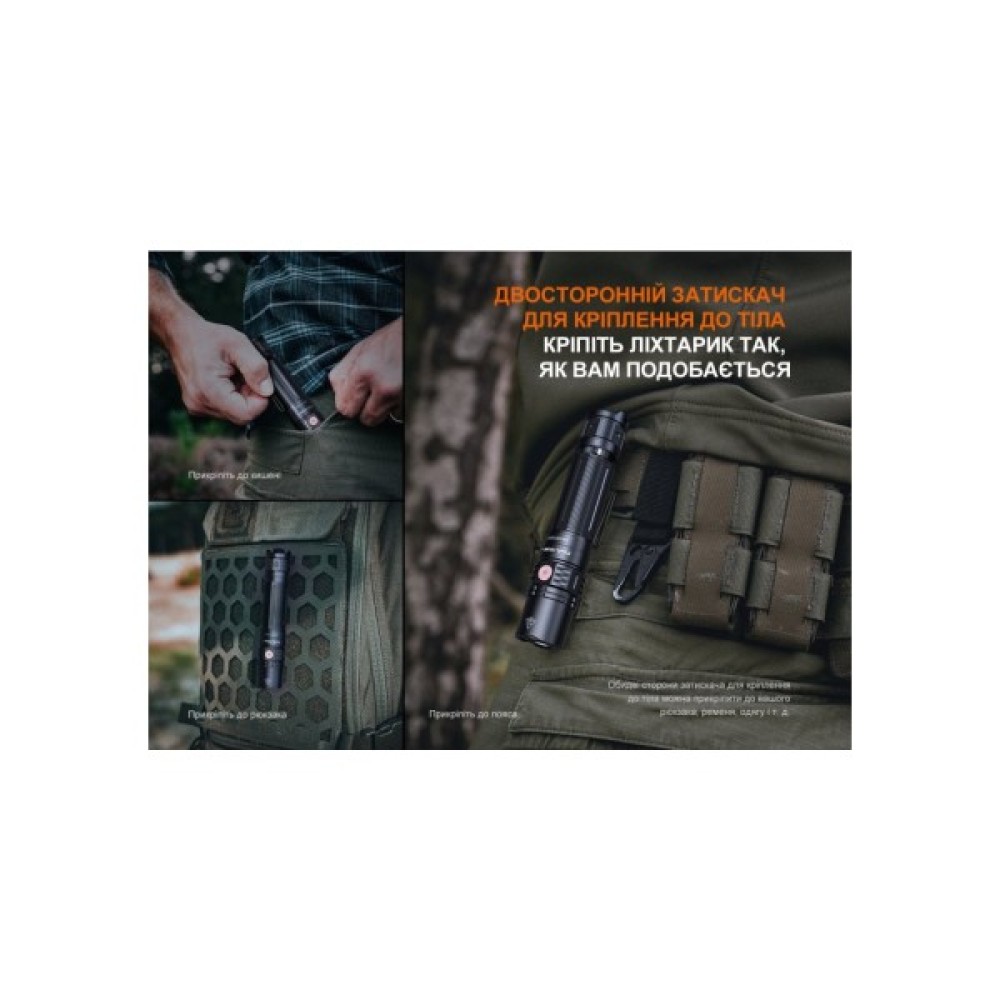 Комплект поставки включає ліхтар PD36R V2.0 зі знімною титановою кліпсою, акумулятор 21700, кабель USB Type-C, запасне ущільнювальне кільце, чохол для носіння на поясі, ремінець на руку, інструкцію та гарантійний талон. Усе це робить ліхтар незамінним помічником, як в повсякденному житті, так і в умовах екстремальних пригод, забезпечуючи світло там, де це найбільше потрібно.