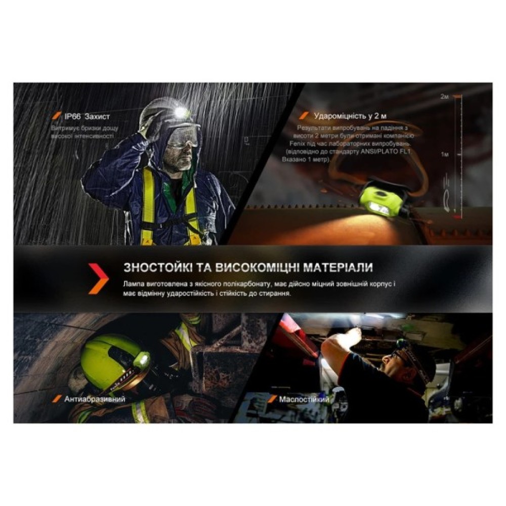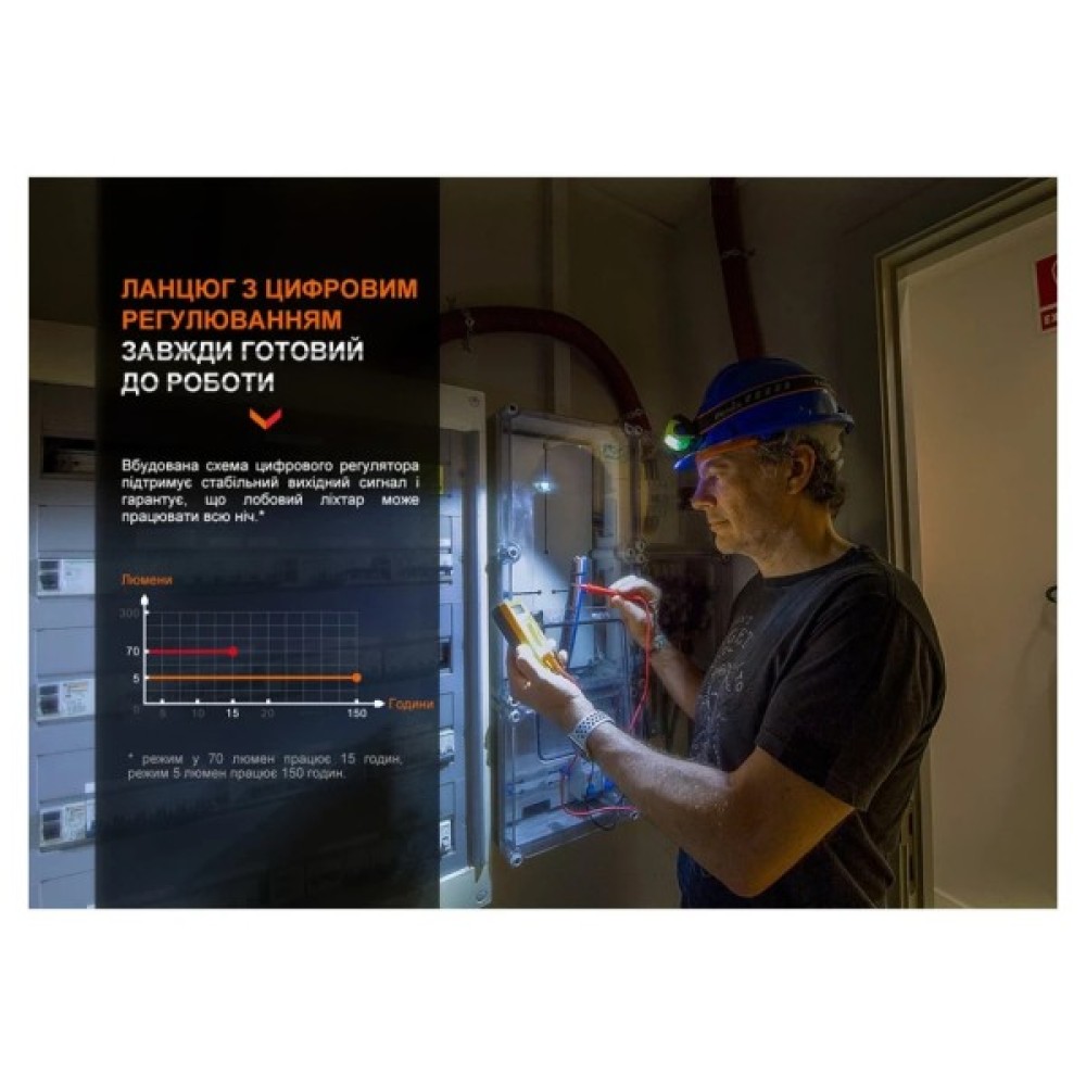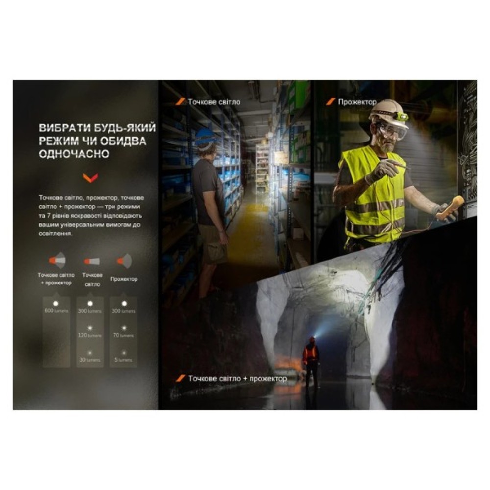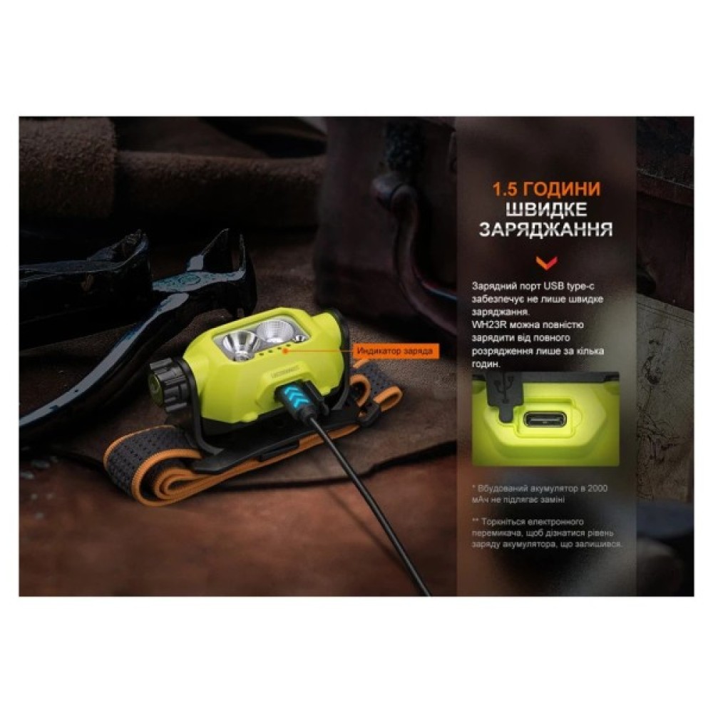 Fenix WH23R пропонує 7 режимів яскравості, серед яких - ближнє світло, дальнє світло та режими від мінімального до максимального. Модель автоматично зберігає вибраний рівень яскравості, що дозволяє наступного разу продовжити користування з тими ж настройками. Додатковою перевагою є захист від перегріву, який автоматично знижує яскравість, щоб запобігти несправностям при довготривалому використанні на максимальному режимі.