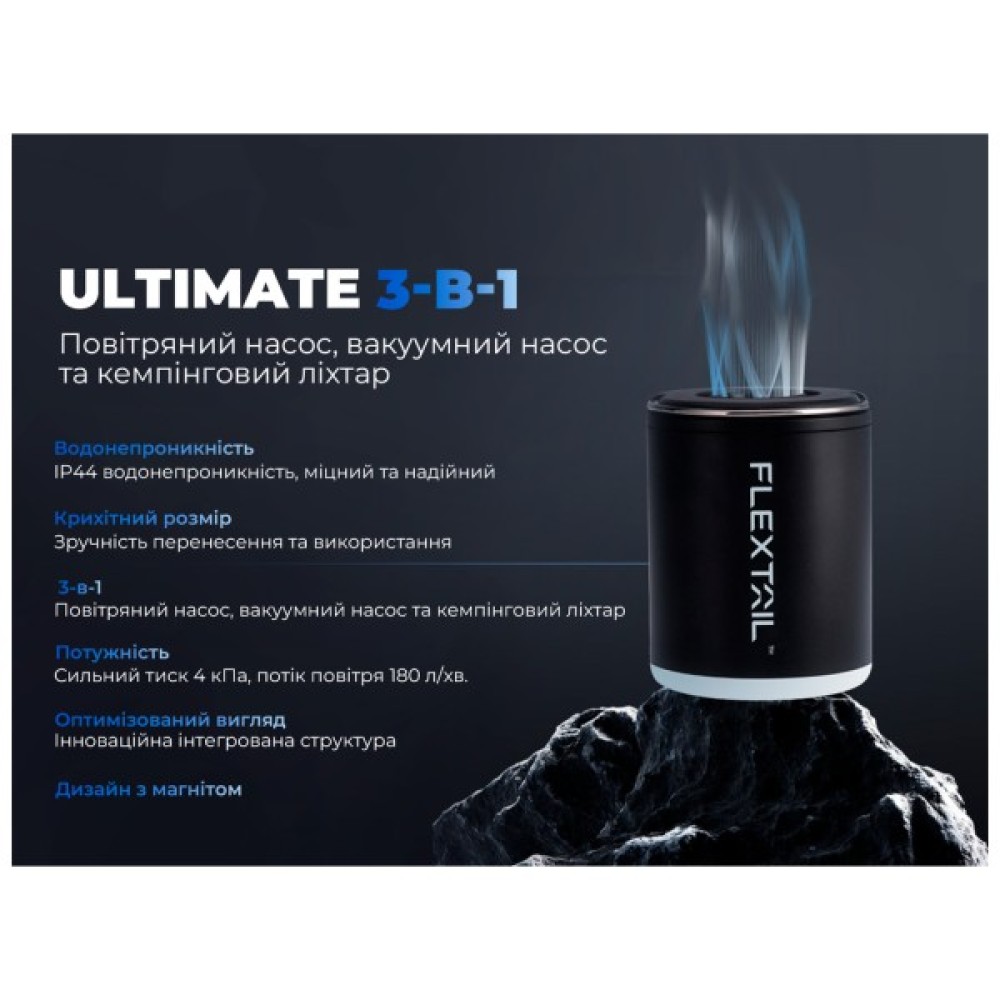Ліхтар Flextail Tiny Pump 2X з функцією насосу чорний (TY2X1600-BK-i) є справжнім проривом у світі кемпінгового обладнання, що поєднує в собі багатофункціональність, надійність та сучасні технології. Цей унікальний гаджет поєднує функції ліхтаря та насосу, роблячи його незамінним компаньйоном для всіх, хто цінує ефективність і компактність.