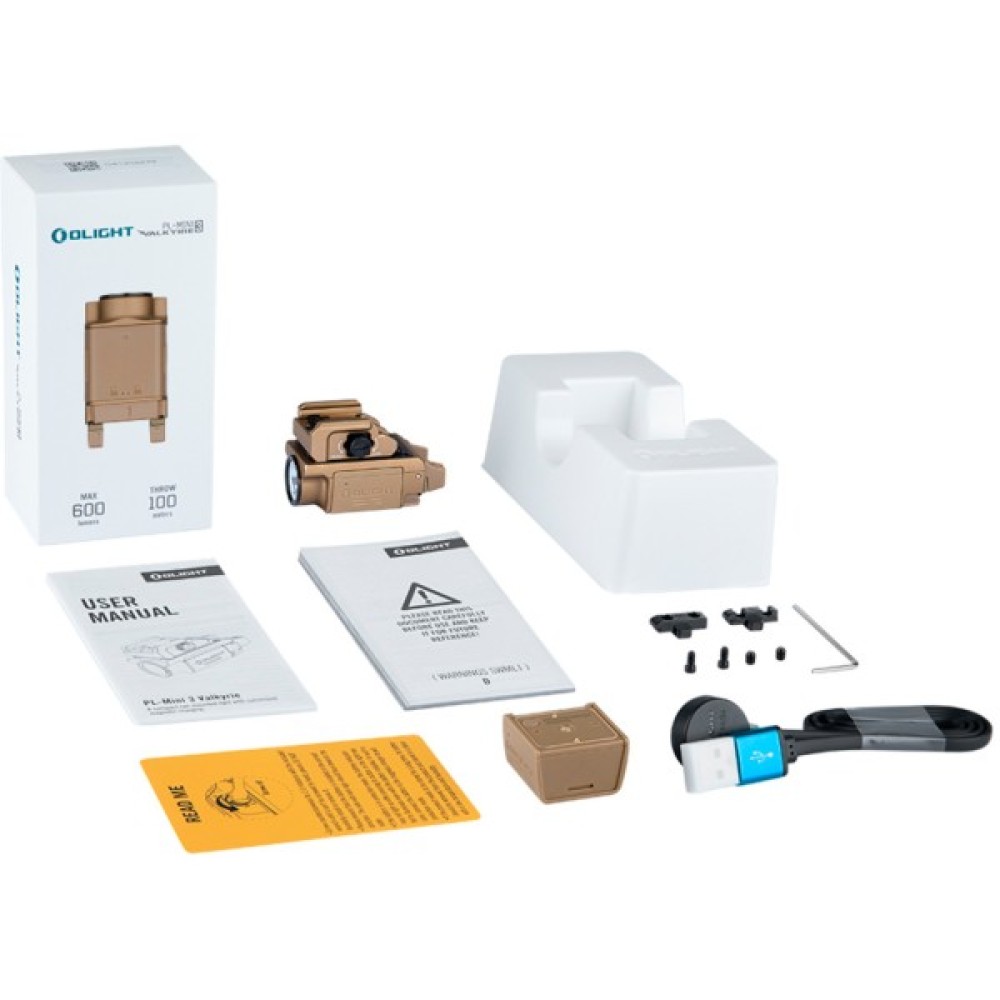 У комплекті з ліхтарем отримуєте все необхідне: Olight PL-Mini 3 Valkyrie, літій-полімерний акумулятор на 260 мАг, адаптери для кріплення, магнітний зарядний кабель IMCC, а також інструментальний набір, що містить гвинти та шестигранний ключ для легкого монтажу. Комплектування зручно упаковане, що дозволяє моментально використовувати пристрій одразу після розпакування.
