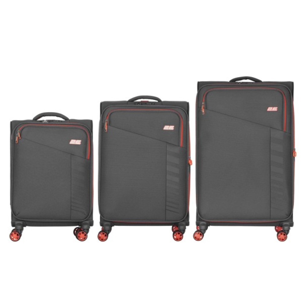На фронтальній поверхні кожної моделі розташовано велику зовнішню кишеню на блискавці для швидкого доступу до документів або дрібних речей. У наборі є три валізи різного розміру: велика (48 × 79 × 30/36 см, 97/117 л, 2,8 кг), середня (43 × 67 × 26/32 см, 64/78 л, 2,5 кг) і мала (38 × 55 × 20 см, 35 л, 1,95 кг). Вдало доповнюють їх три рюкзаки 2E Cabin Size (код товару: 2E-BPET-CABIN-BK) – легкі моделі з поліестеру з можливістю розширення (об’єм 17/23 л), відділенням для ноутбука 15,6–16″ (38 × 28 × 3 см) і вагою лише 0,75 кг. До того ж вони пристосовані для транспортування авіаперевізниками у форматі ручної поклажі.