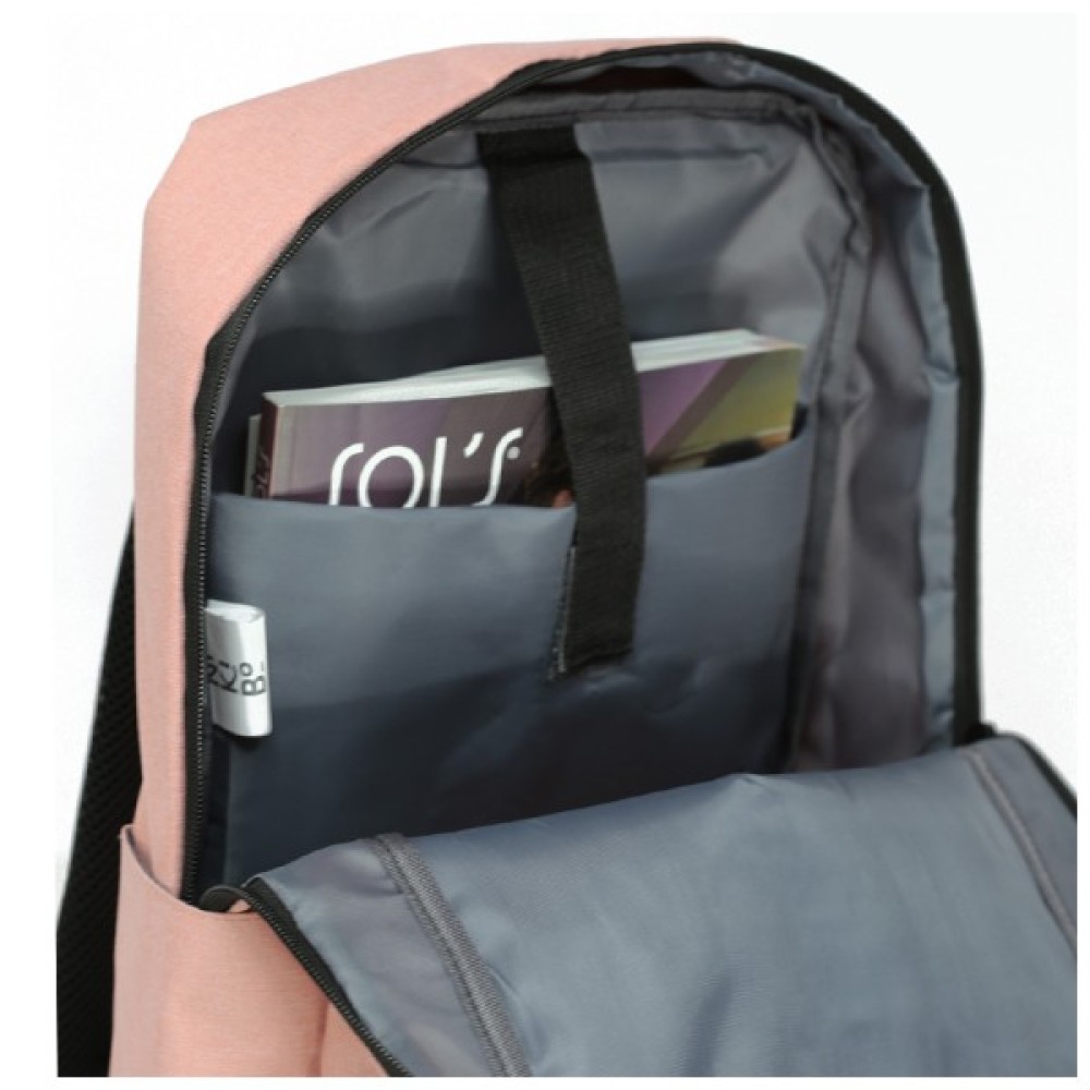 Рюкзак має зручну конструкцію: всередині — одне велике відділення на блискавці з м’якою кишенею для ноутбука. Зовні — містка передня кишеня з горизонтальною застібкою-блискавкою, декорована стрічкою зі світловідбивальним ефектом.