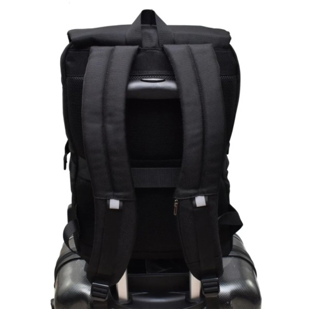Рюкзак виконаний з міцного водостійкого поліестеру 900D з внутрішнім PVC покриттям. На тильній стороні рюкзака знаходиться поперечна стрічка для кріплення на телескопічні ручки валіз і сумок. Модель має м'які ергономічні шлейки, дихаючу м'яку спинку і міцну петлю для підвішування.