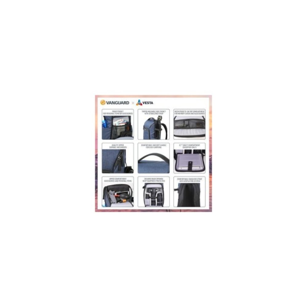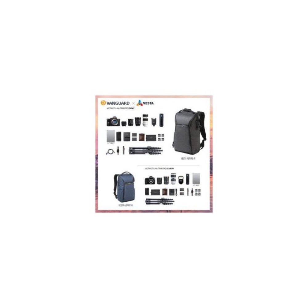 Коли Ви готові перейти від знімків в смартфоні до справжньої фотографії, рюкзаки Vanguard Vesta Aspire - це саме те, що Вам необхідно, звичайно ж, поряд із самою фотокамерою. Vesta Aspire 41 втілює концепцію "мінімум для максимуму". При невеликих зовнішніх розмірах і скромному внутрішньому об'ємі цей рюкзак здатний вмістити повний набір початківця фотографа, включаючи повнорозмірний штатив, і особисті речі. Розроблений для найпопулярніших комплектів камер, Vesta Aspire забезпечує відмінний захист від ударів і вологи, а також функціональність поряд з інтуїтивно зрозумілим компонуванням кишень і відділень.
