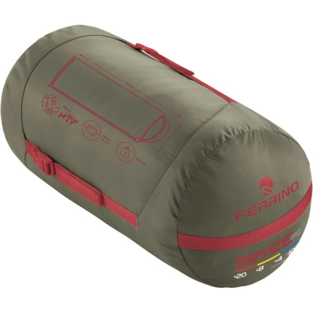 Ferrino Bryce (86376MVVS) - перші екологічно чисті спальні мішки Ferrino, виготовлені з перероблених тканин та наповнювачів Repreve. Для виготовлення кожного мішка використовується близько тридцяти півлітрових ПЕТ-пляшок. Рекомендується для трьох сезонних походів. Абсолютно всі спальні мішки Ferrino відповідають міжнародному стандарту ISO 23537-1:2016. Даний стандарт нормує вимоги до спальних мішок та підтверджує відповідність зазначених температурних режимів, розмірів та ваги на ярликах.