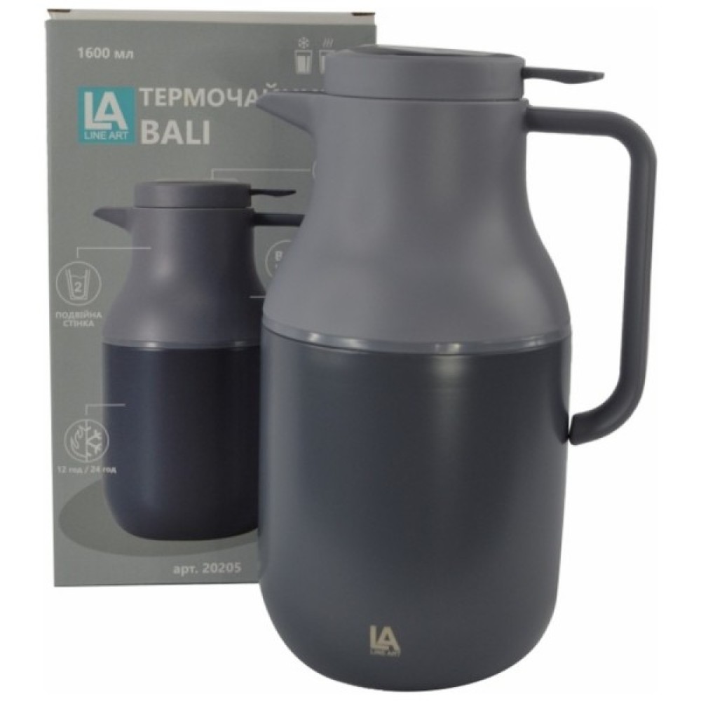 Термос Line Art Bali 1,6 л сірий/темно-синій (20205LA-44) - це стильне та функціональне рішення для любителів гарячих і холодних напоїв. Поєднуючи витончений дизайн із передовими технологіями, цей термочайник викликає захоплення своєю естетикою та можливостями. Виготовлений із добірних матеріалів, корпус термоса виглядає елегантно завдяки комбінації сірого та темно-синього кольорів. Цей продукт підійде як для жіночої, так і для чоловічої аудиторії, адже його дизайн універсальний і підходить для будь-якої ситуації.