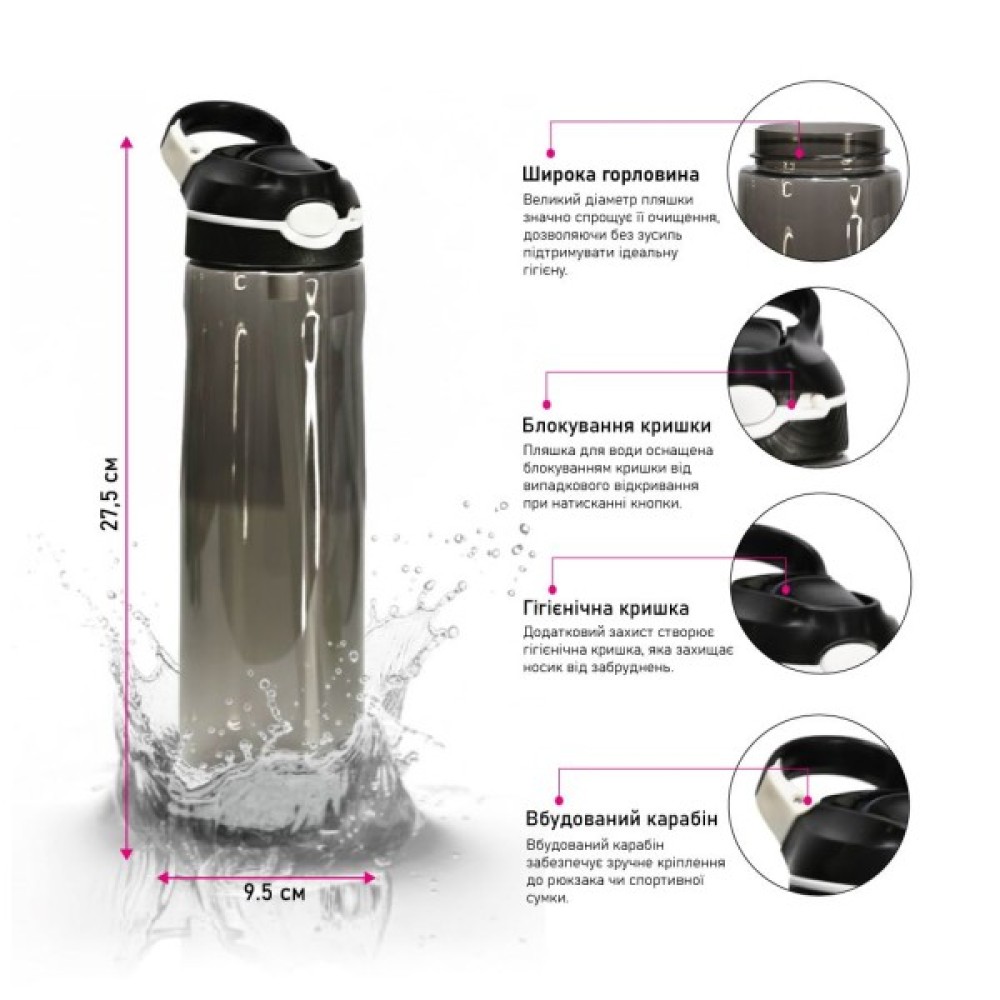 Пляшка оснащена кнопкою блокування та кришкою, що захищає силіконовий носик. Внутрішня трубочка забезпечує зручне пиття без нахилу. Широке горлечко спрощує очищення та наповнення. Карабін дозволяє кріпити пляшку до рюкзака або спортивної сумки.