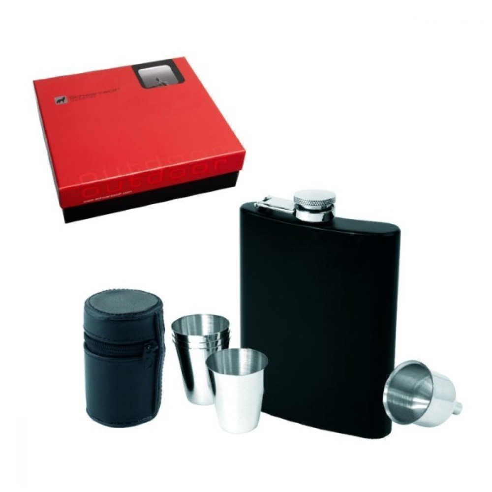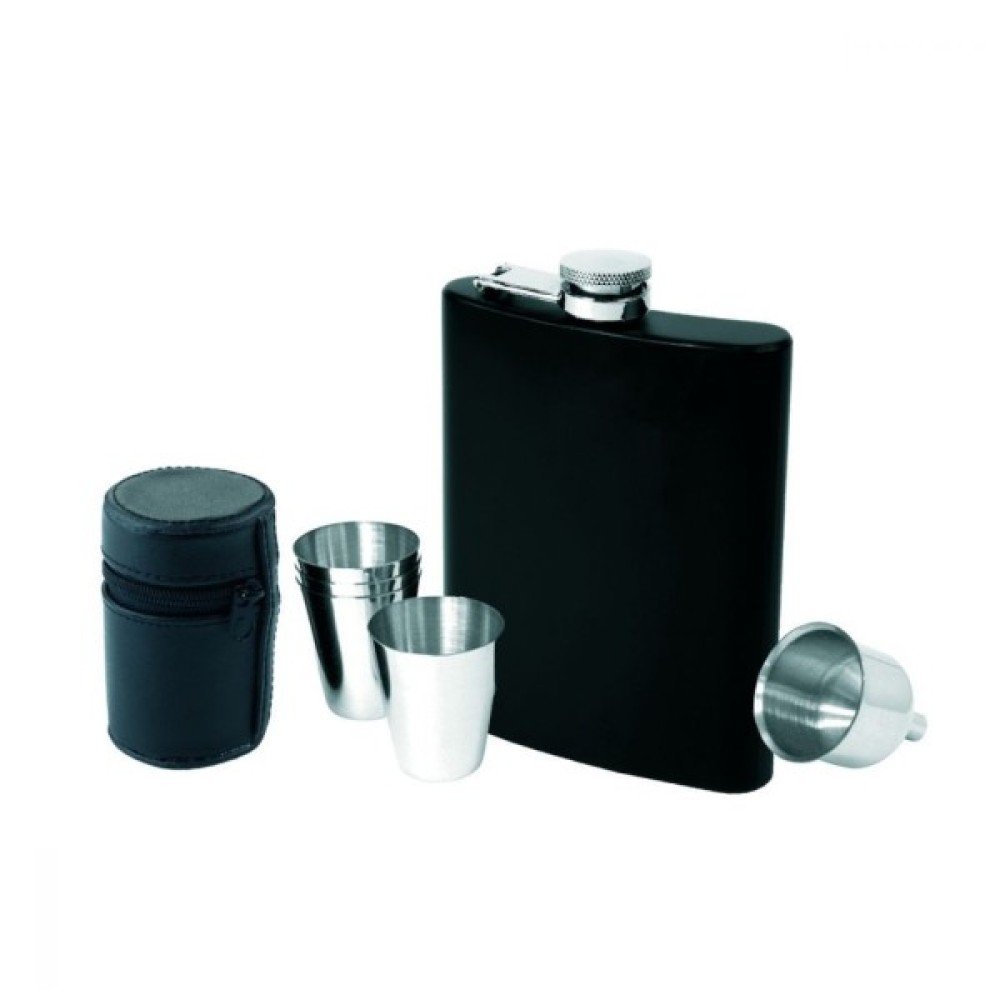 • Включає: чорну флягу з нержавіючої сталі, 4 чарки 30 мл в чорному чохлі, лійка