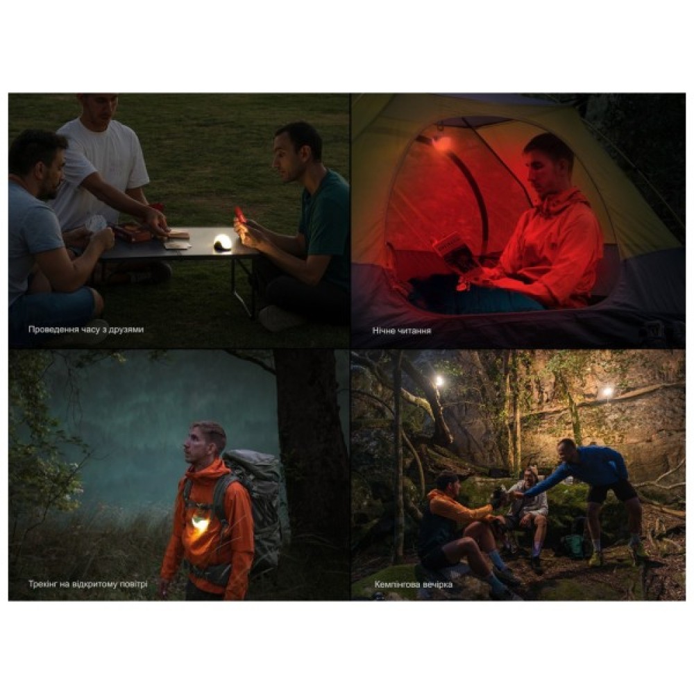Зручне керування дозволяє обрати один з 13 режимів яскравості. Ви можете скористатися чотирма рівнями білого світла, п’ятьма "сценічними" режимами та чотирма варіантами підсвічування навколо кнопки управління. Місячне сяйво з потужністю 1 лм протягом 320 годин стане ідеальним нічником у палатці.