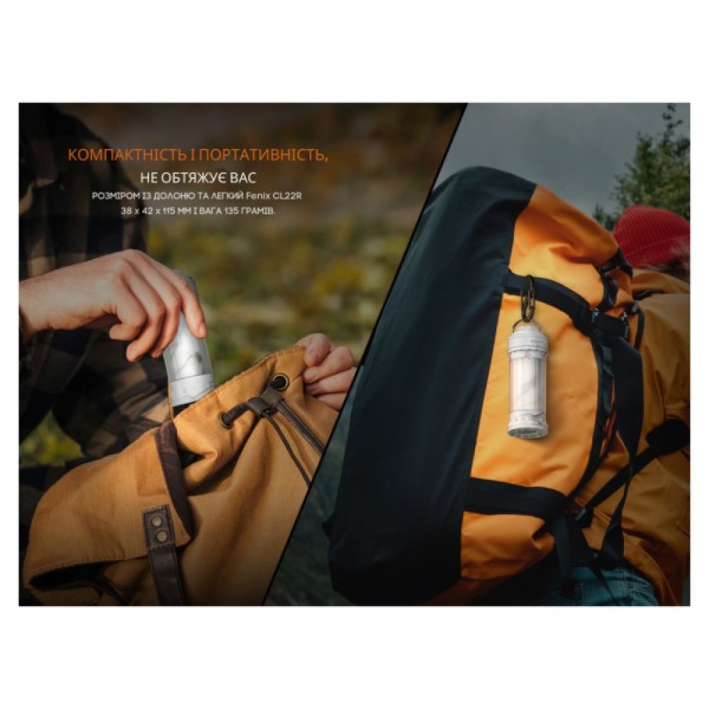 Невеликі розміри (38 х 42 х 115 мм) та вага в 135 г дозволяють зручно транспортувати цей ліхтар, а різноманітні варіанти кріплення – використовувати його як для підвішування, так і як кишеньковий ліхтар. В комплектацію входять карабін та кабель для заряджання, що робить Fenix CL22R готовим до експлуатації з моменту покупки.