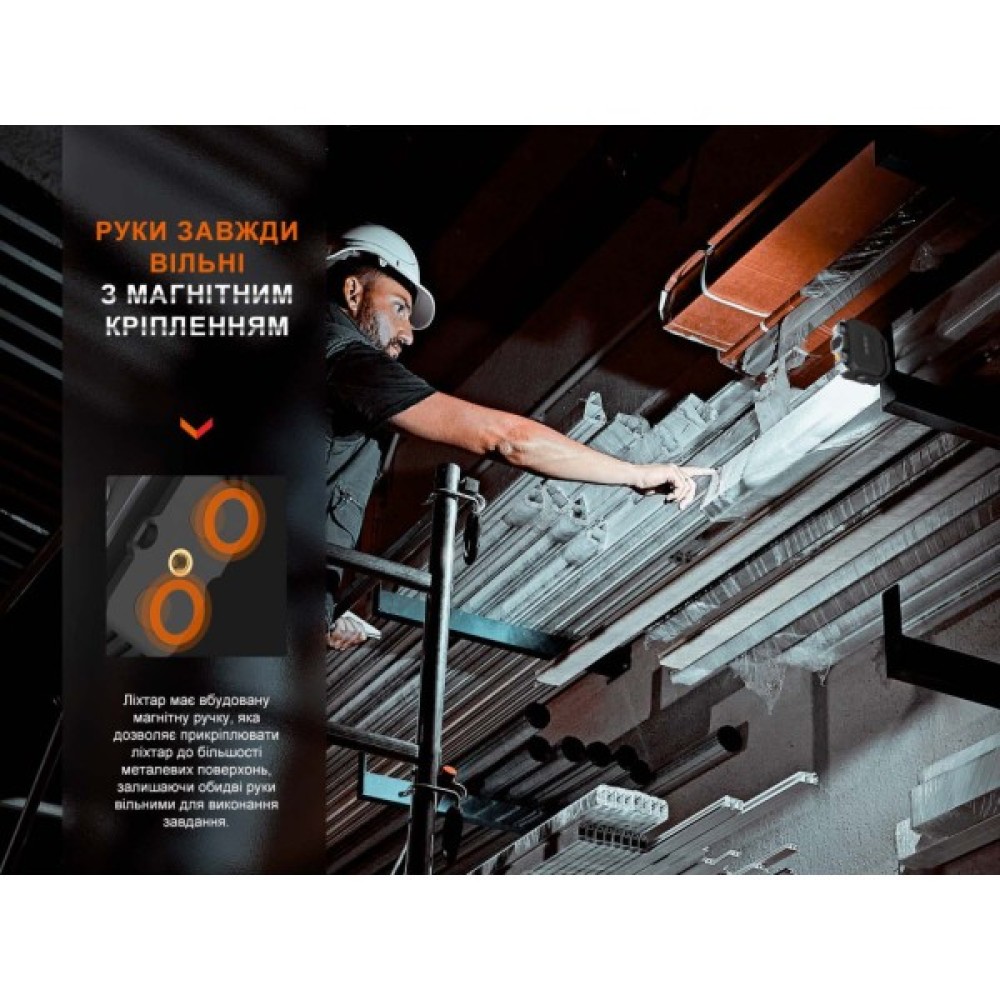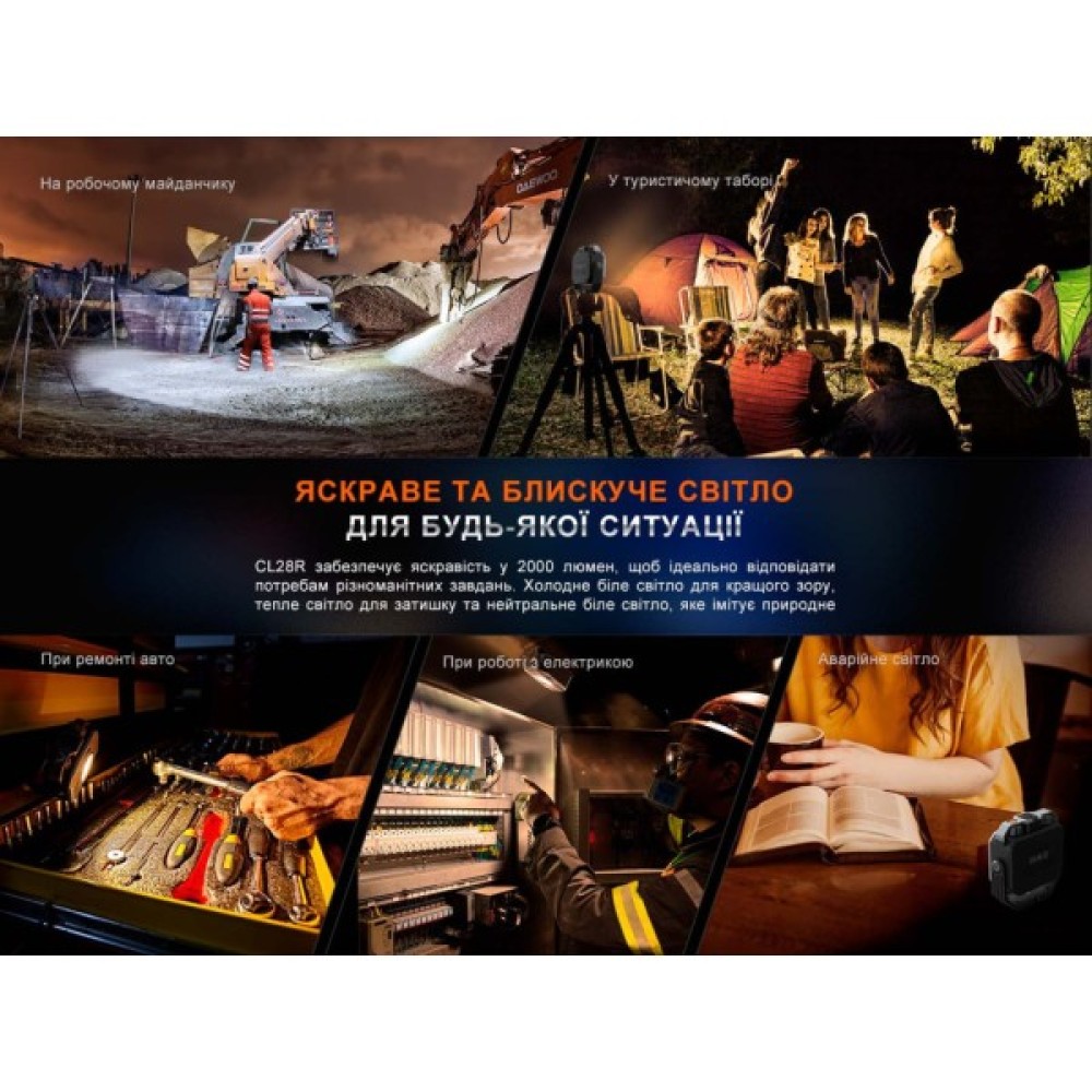 Ліхтар оснащений магнітною основою для кріплення на металевих поверхнях, а також гніздом для штатива, що робить його універсальним освітлювальним приладом як у стаціонарному, так і в підвішеному за рукоять стані. Маючи вагу лише 376 грам і довжину 100 мм, Fenix CL28R стає ідеальним вибором для будь-яких умов, підтримуючи ваш комфорт та безпеку, незалежно від обставин.