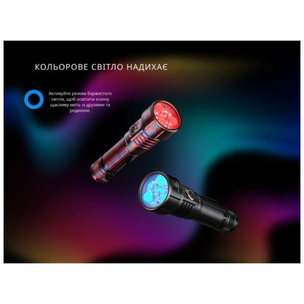 Ліхтар має унікальний дифузійний фільтр AOD-04, який перетворює спрямований промінь на розсіяне світло, освітлюючи простір на 360°, що створює максимально комфортні умови для будь-якої діяльності. Завдяки 14 варіантам освітлення, ви можете вибрати найкращий режим під конкретні потреби завдяки розділенню режимів на білі та кольорові групи.
