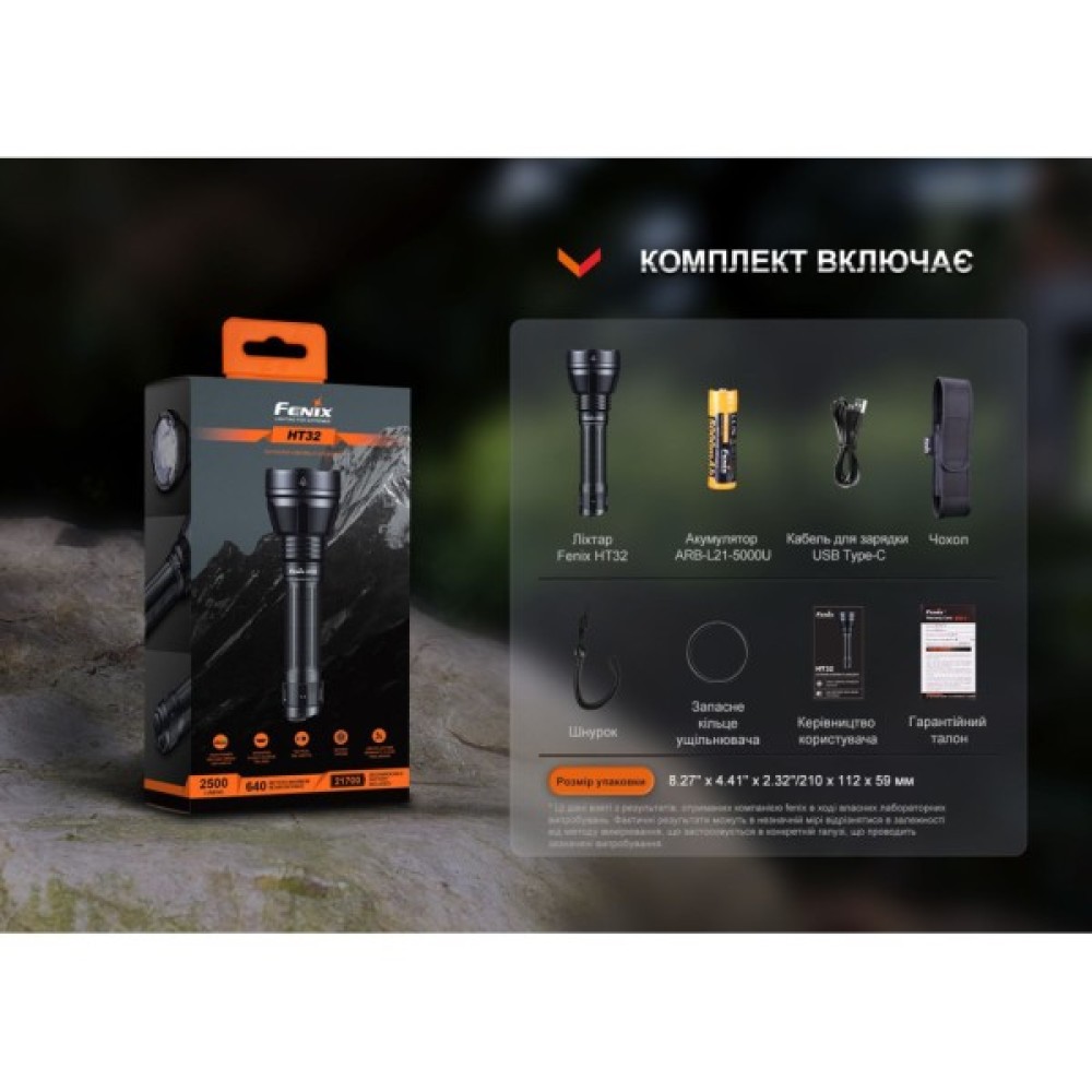 Також в комплект входять запчастини та аксесуари на випадок несподіваних ситуацій: запасне ущільнювальне кільце, гумове кільце, ремінець на руку та кабель для заряджання. Таким чином, Fenix HT32 обов'язково стане вашим незамінним партнером у зовнішніх пригодах.